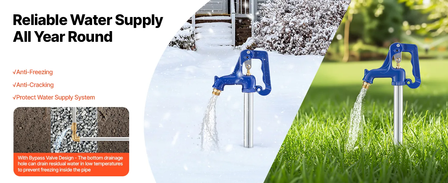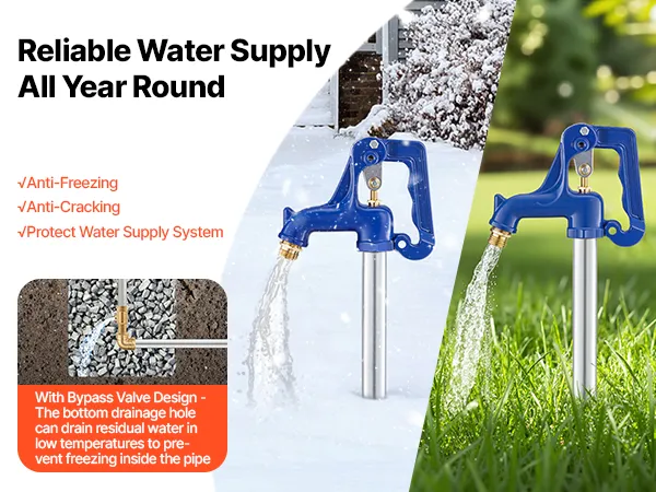 Verbeterd vorstbestendig ontwerp: Onze vorstbestendige tuinkraan is voorzien van een bypassklep die bij koud weer restwater via de onderste opening afvoert. Dit voorkomt dat water zich in de leiding ophoopt en bevriest, waardoor een ononderbroken watertoevoer het hele jaar door gegarandeerd is.