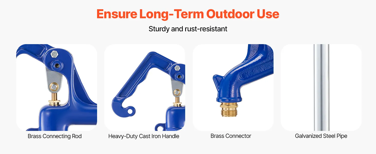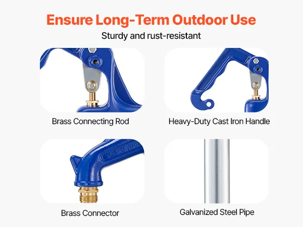Gemaakt met een robuuste gietijzeren handgreep, messing koppelingen en gegalvaniseerde stalen buizen, is onze vorstbestendige waterkraan duurzaam, corrosiebestendig, scheurvast en betrouwbaar voor langdurig gebruik buitenshuis in alle weersomstandigheden.