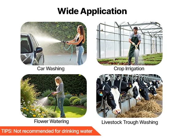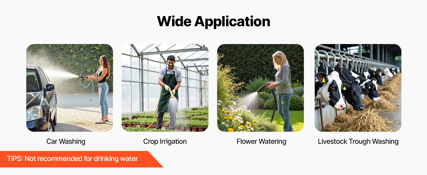 Zorgt voor een constante waterstroom bij het wassen van auto's, het besproeien van gewassen, het beregenen van tuinen en het schoonmaken van drinkbakken voor vee, en voldoet zo gemakkelijk aan diverse waterbehoeften buitenshuis.