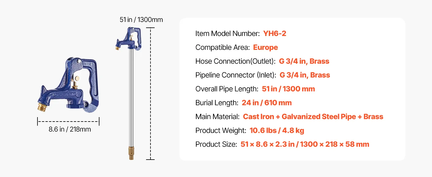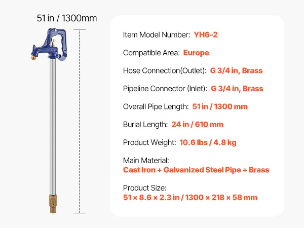 Houd het water stromend: onze 51"/1300 mm lange vorstbestendige tuinkraan met een graafdiepte van 24"/610 mm past zich aan de vorstgrenzen in verschillende regio's aan en voorkomt effectief dat leidingen en kranen bevriezen. Uitgerust met een G 3/4 inch slangkoppeling en een G 3/4 inch pijpconnector, is hij eenvoudig te installeren en perfect voor tuinirrigatie, autowassen of boerderijirrigatie.