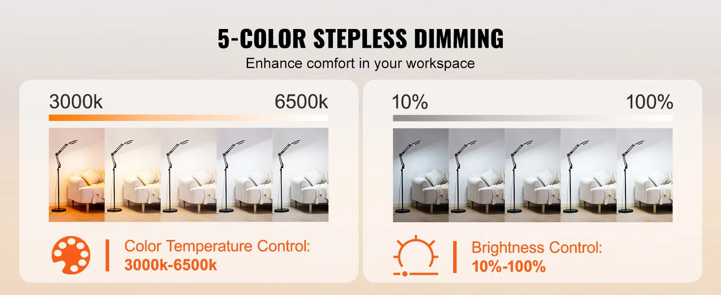 Flexible Support Arm: Say goodbye to limitations and enjoy the freedom of all-around lighting! The adjustable support arm design allows you to adjust the lamp to any angle, achieving illumination without dead spots. Whether in tight spaces or wide areas, the flexibility of the magnifying floor lamp with light meets all your lighting needs.