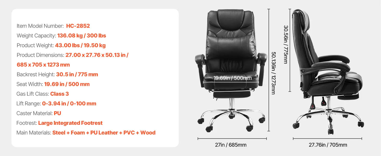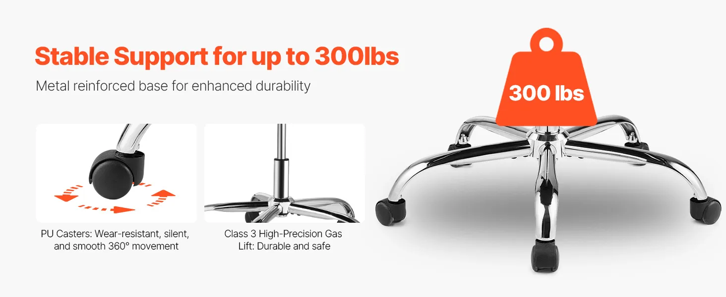 Built to Last: This heavy-duty executive desk chair is designed to support up to 136.08 kg / 300 lbs, making it a great choice for both home and office use. With a generously padded seat and a reinforced metal base, it promises comfort and durability for years to come.