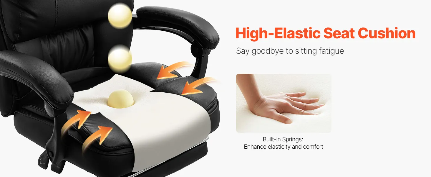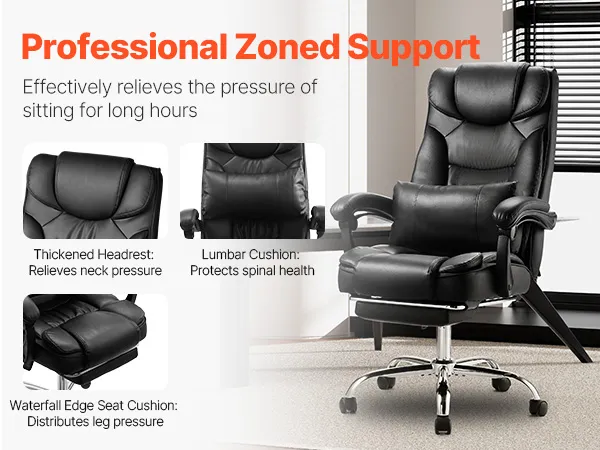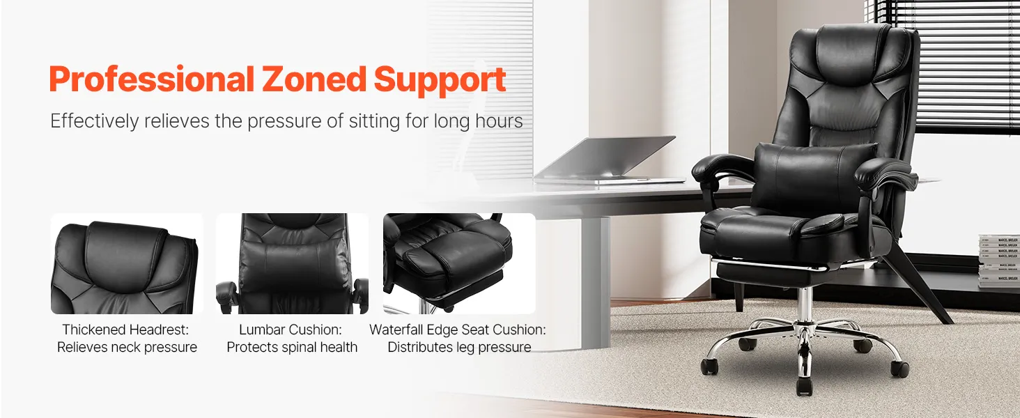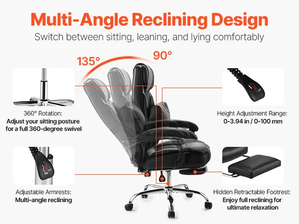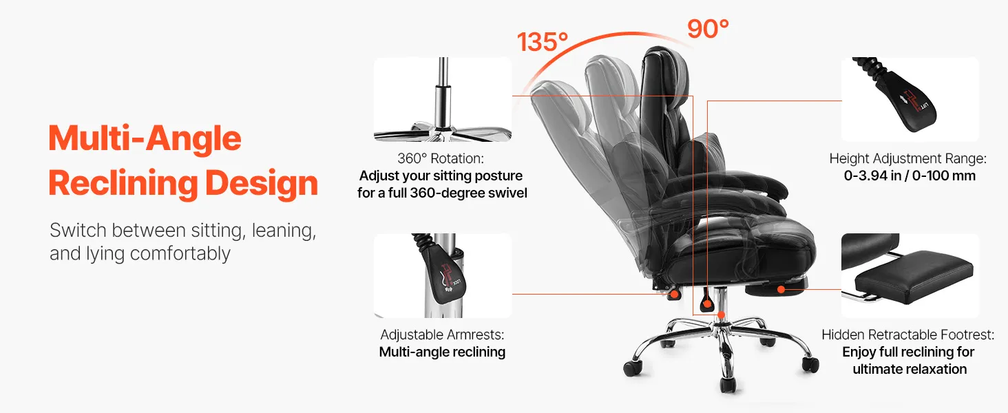 Adjustable Recline: Designed with a reclining angle that adjusts from 90° to 135°, this executive office chair offers a customizable relaxation experience. The thickened armrests and built-in lumbar pillow work together to reduce fatigue from long hours of sitting. Plus, the hidden, retractable footrest lets you stretch out and unwind, relieving work stress with ease.