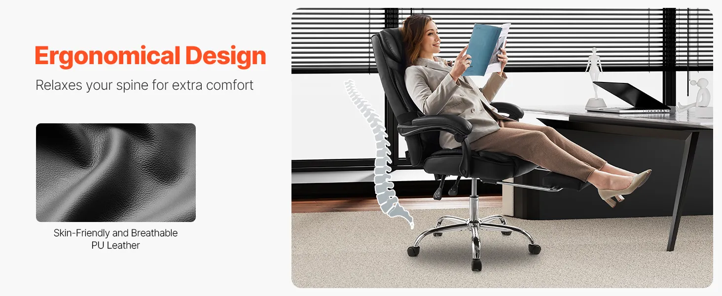 VEVOR Executive Chair, High Back Office Chair with Footrest and Lumbar Pillow, Ergonomic Desk Chair 135° Recline & Adjustable Height, PU Leather Swivel Rolling Chair for Work, Study, Game, Black