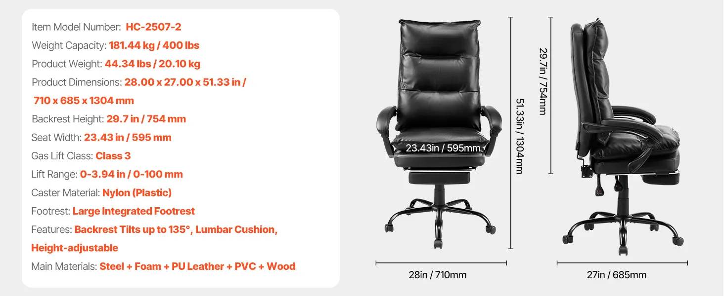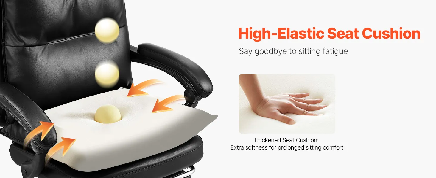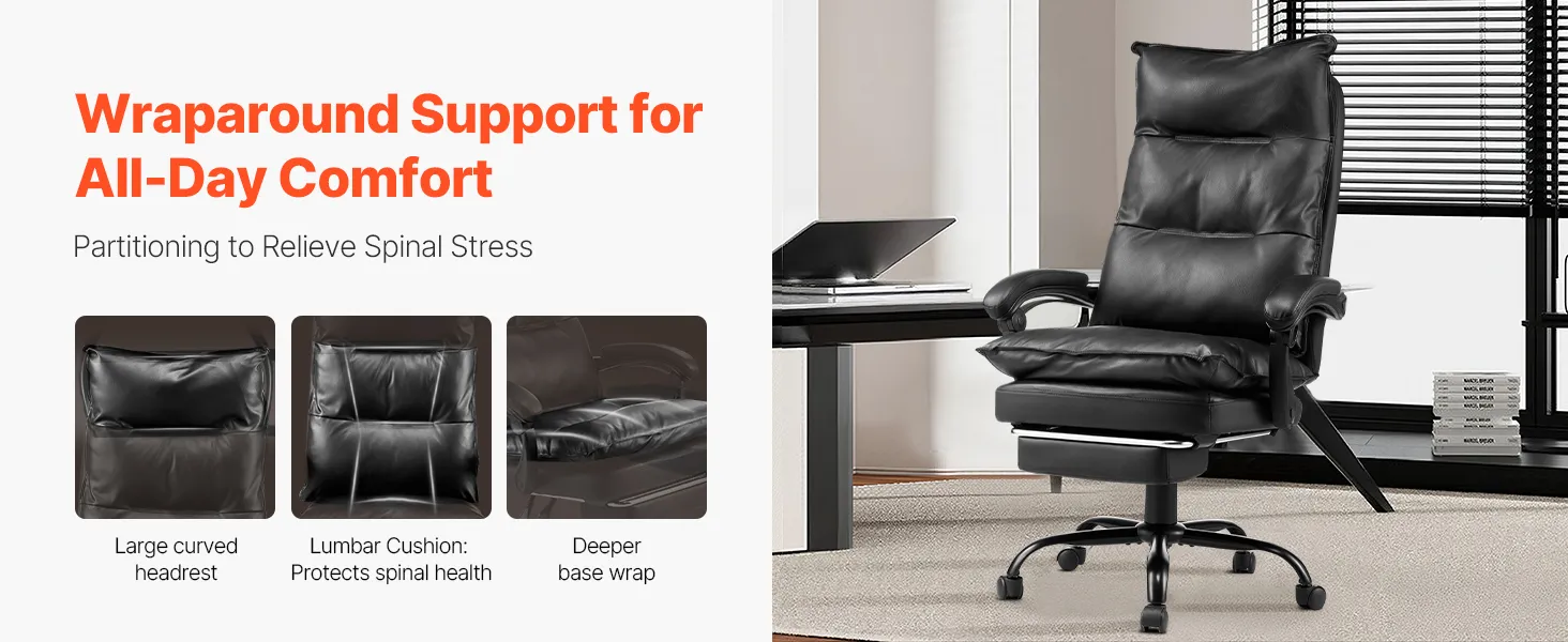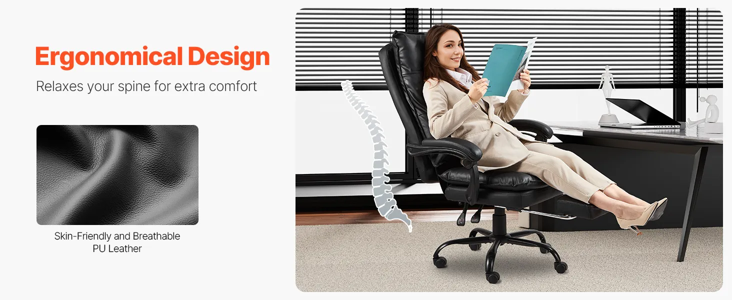 VEVOR Executive Bureaustoel Draaistoel met Hoge Rugleuning, Voetsteun en Lendenkussen, Ergonomische Bureaustoel met 135° Kantelhoek en Verstelbare Hoogte voor Werk, Studie, Gamen