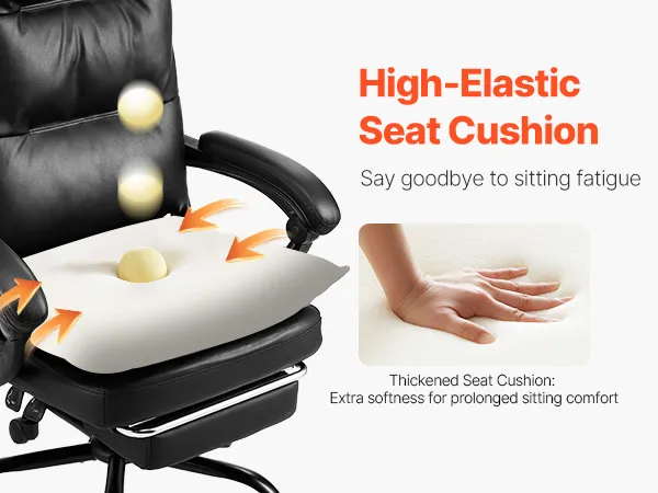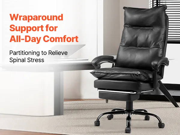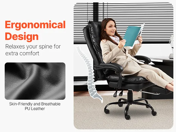 Ergonomisch comfort: De hoge rugleuning en de ergonomische contouren van de wervelkolom van deze bureaustoel met hoge rugleuning bieden de ondersteuning die uw rug nodig heeft om de hele dag ontspannen te blijven. Het zachte, hoogwaardige schuimkussen in combinatie met hoogwaardig leer zorgt ervoor dat u het gevoel heeft dat u op een comfortabele bank zit, of u nu werkt of pauze neemt