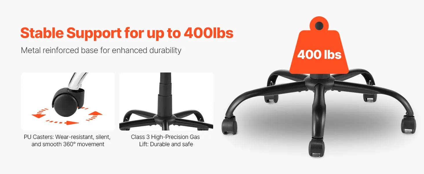 Eenvoudige hoogteverstelling: verstel de stoelhoogte eenvoudig met de nauwkeurige gasveer. Deze heeft een bereik van 0 tot 10 cm (0 tot 3,94 inch) en is geschikt voor mensen van verschillende lengtes. Of het nu voor uw gezinsleden thuis is of voor uw medewerkers op kantoor: deze bureaustoel past zich aan uw behoeften aan.