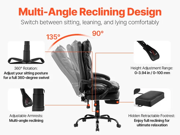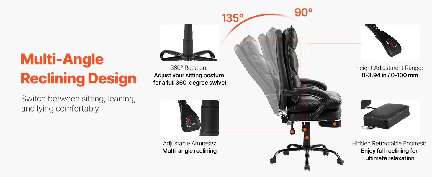 Verstelbare helling: Deze bureaustoel met een kantelhoek van 90° tot 135° biedt een individuele ontspanningservaring. De verstevigde armleuningen en het ingebouwde lendensteunkussen zorgen er samen voor dat vermoeidheid door langdurig zitten wordt verminderd. Bovendien kunt u zich uitstrekken en ontspannen op de verborgen uitschuifbare voetensteun, waardoor u moeiteloos de werkstress verlicht