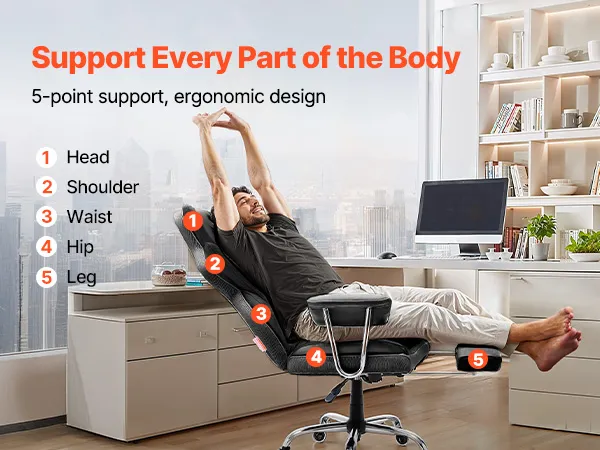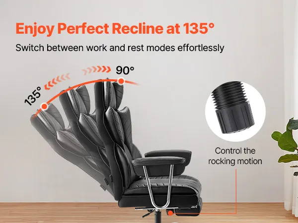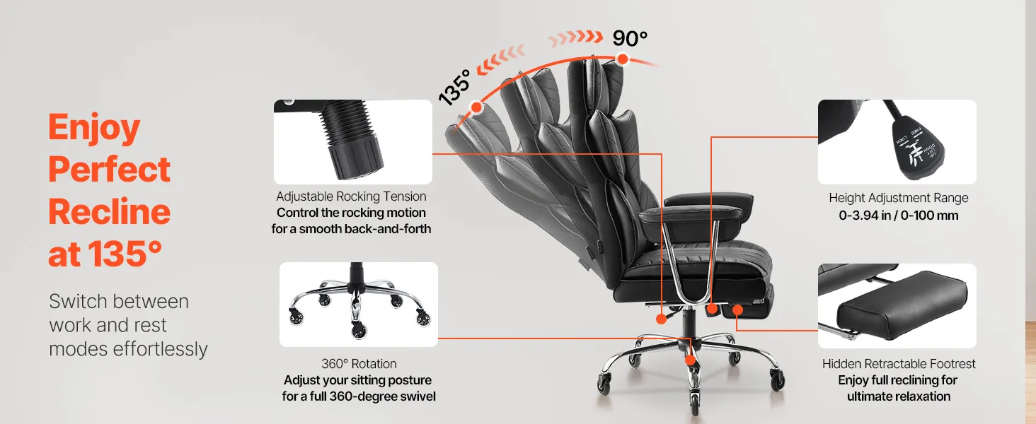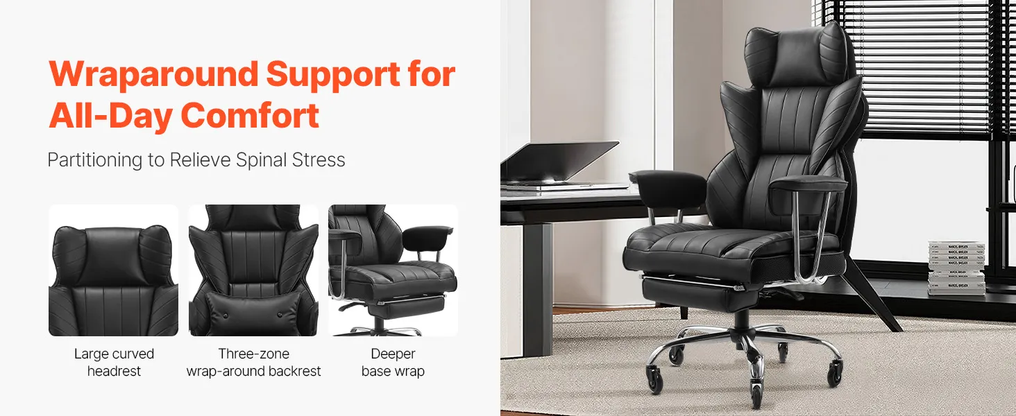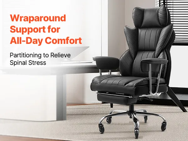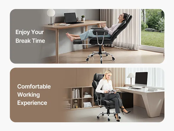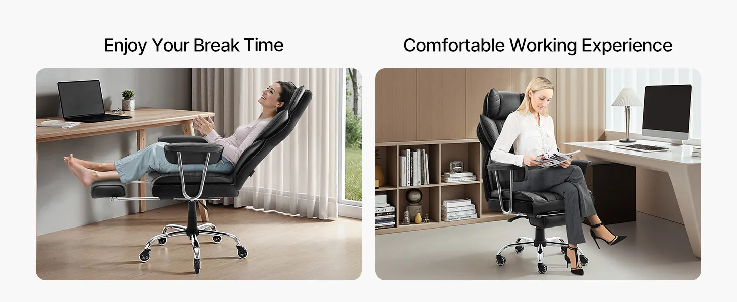 Ergonomisch comfort: De hoge rugleuning en de ergonomische contouren van de wervelkolom van deze bureaustoel met hoge rugleuning bieden de ondersteuning die uw rug nodig heeft om de hele dag ontspannen te blijven. Het zachte, hoogwaardige schuimkussen in combinatie met hoogwaardig leer zorgt ervoor dat u het gevoel heeft dat u op een comfortabele bank zit, of u nu werkt of pauze neemt