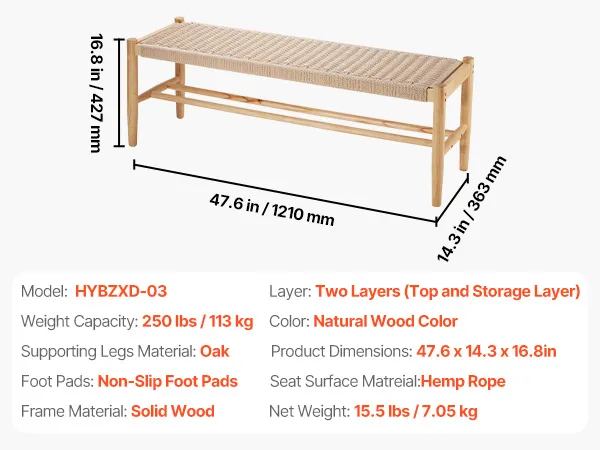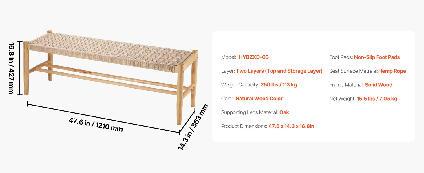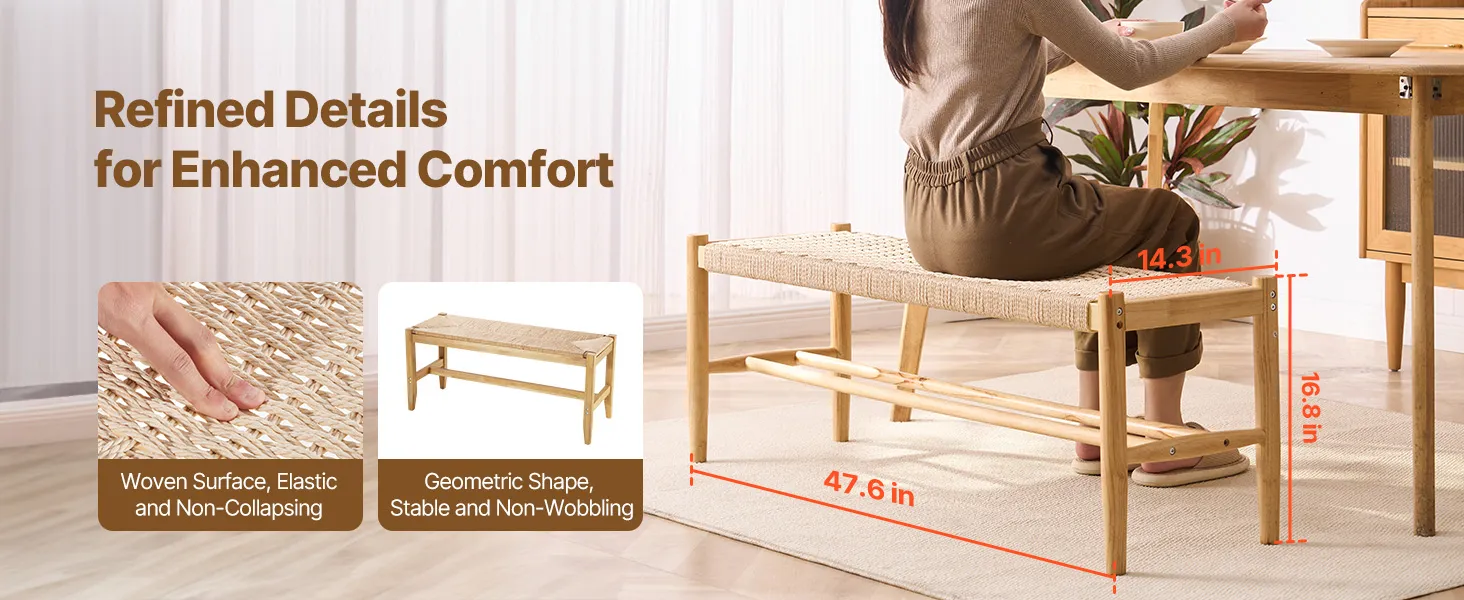 The rattan bench features a durable woven rope seat that won’t sag. Its solid wood frame and polished oak legs ensure stability. It supports up to 250 lbs, comfortably seats two adults, and is ideal for bedrooms, entryways, or dining rooms.