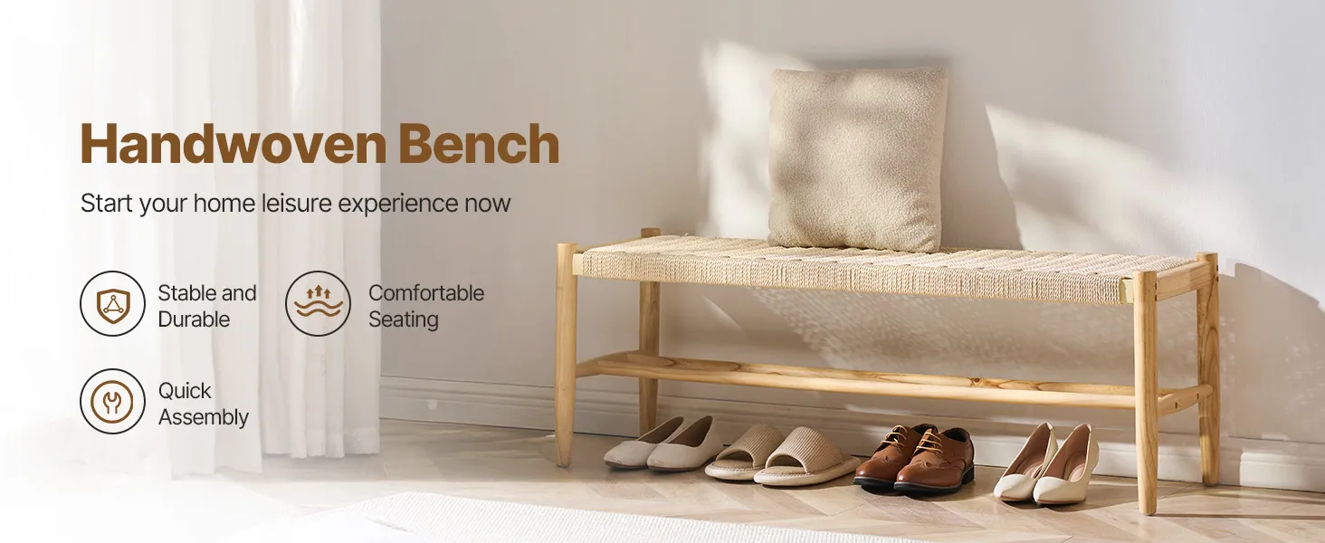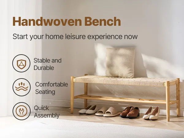 Handwoven Style: This rattan bench combines solid wood and handwoven rope, creating a stylish piece that enhances any entryway. With its natural look and artisanal touch, this bench is a ideal addition to your home, bringing warmth and comfort to your everyday life.