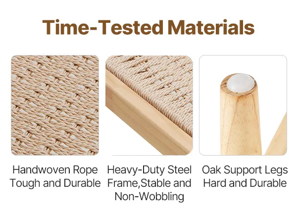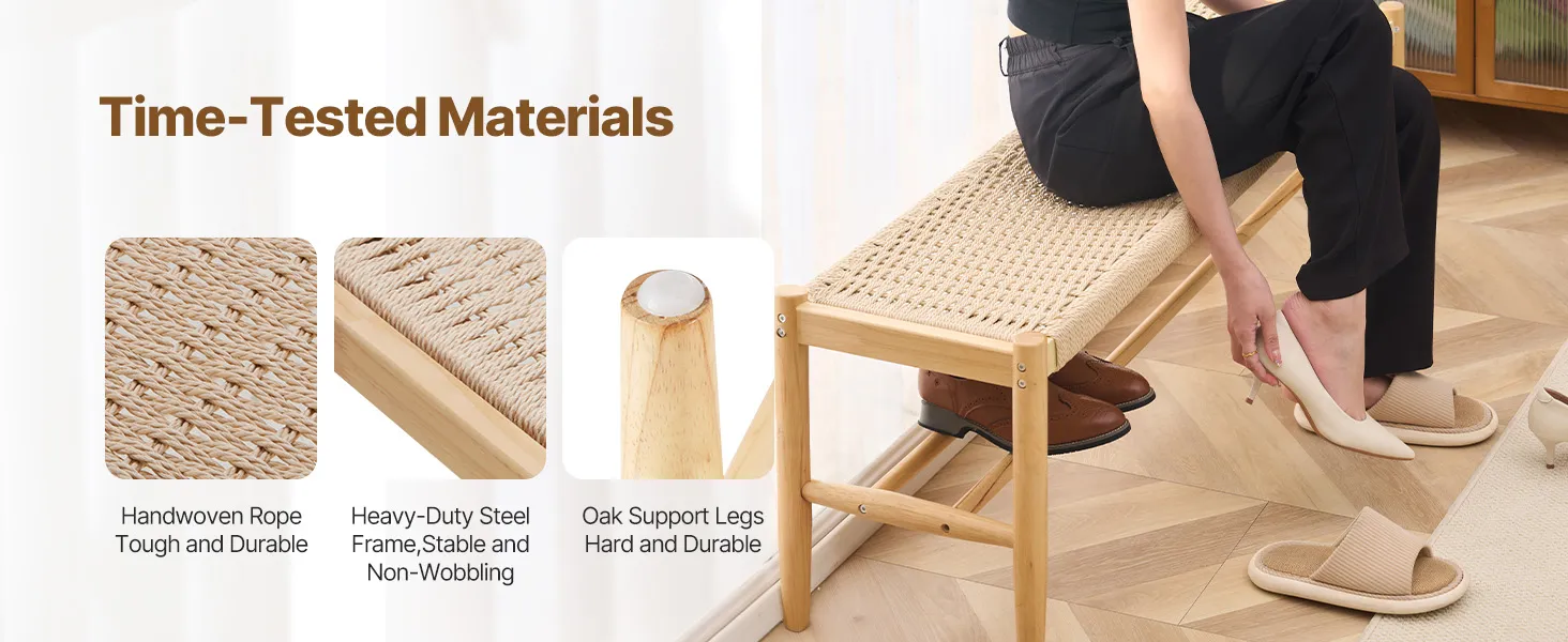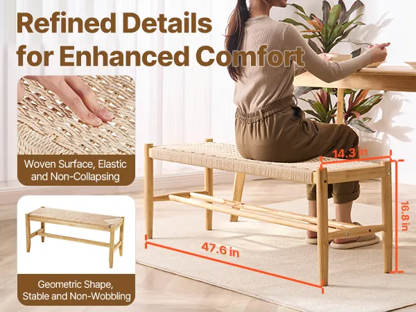 Quality and Stability: This entryway rattan bench offers quality and stability with its handwoven rope surface that avoids sagging, ensuring you can sit comfortably for hours. It stays cool in winter and breezy in summer! The solid wood frame and polished natural oak legs mean this bench is not just beautiful but also built to last.