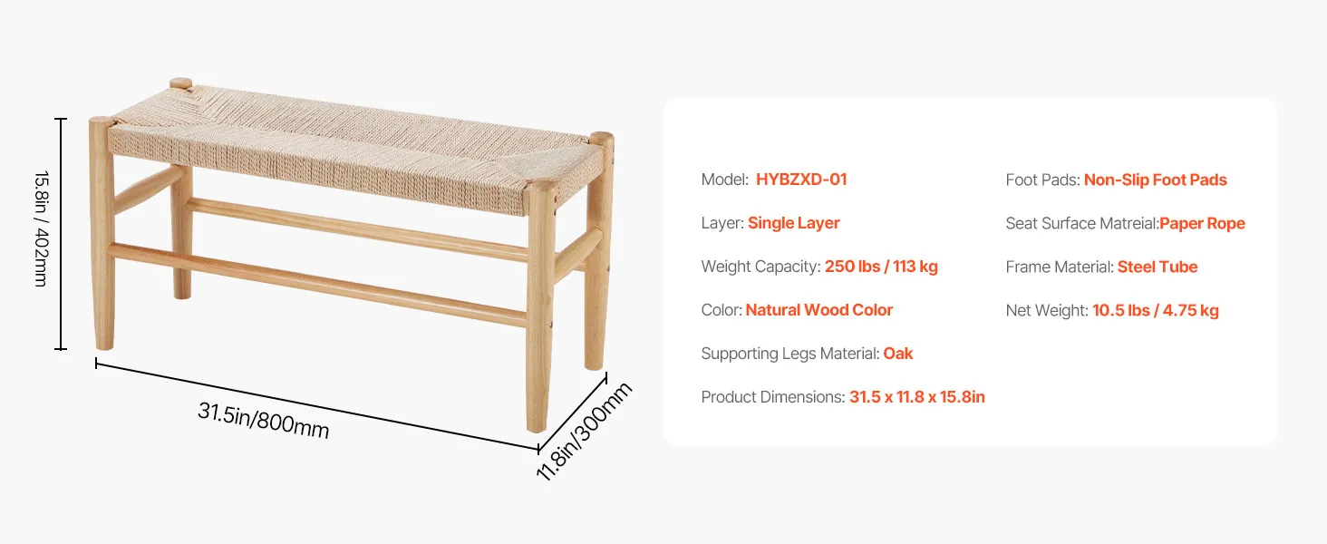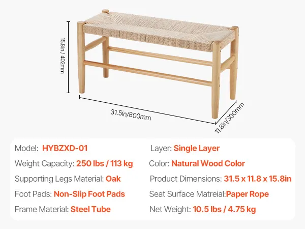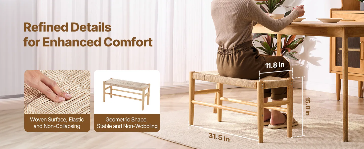 The rattan bench features a durable woven rope seat that won’t sag. Its heavy-duty steel frame and polished oak legs ensure stability. It supports up to 250 lbs, comfortably seats two adults, and is ideal for bedrooms, entryways, or dining rooms.