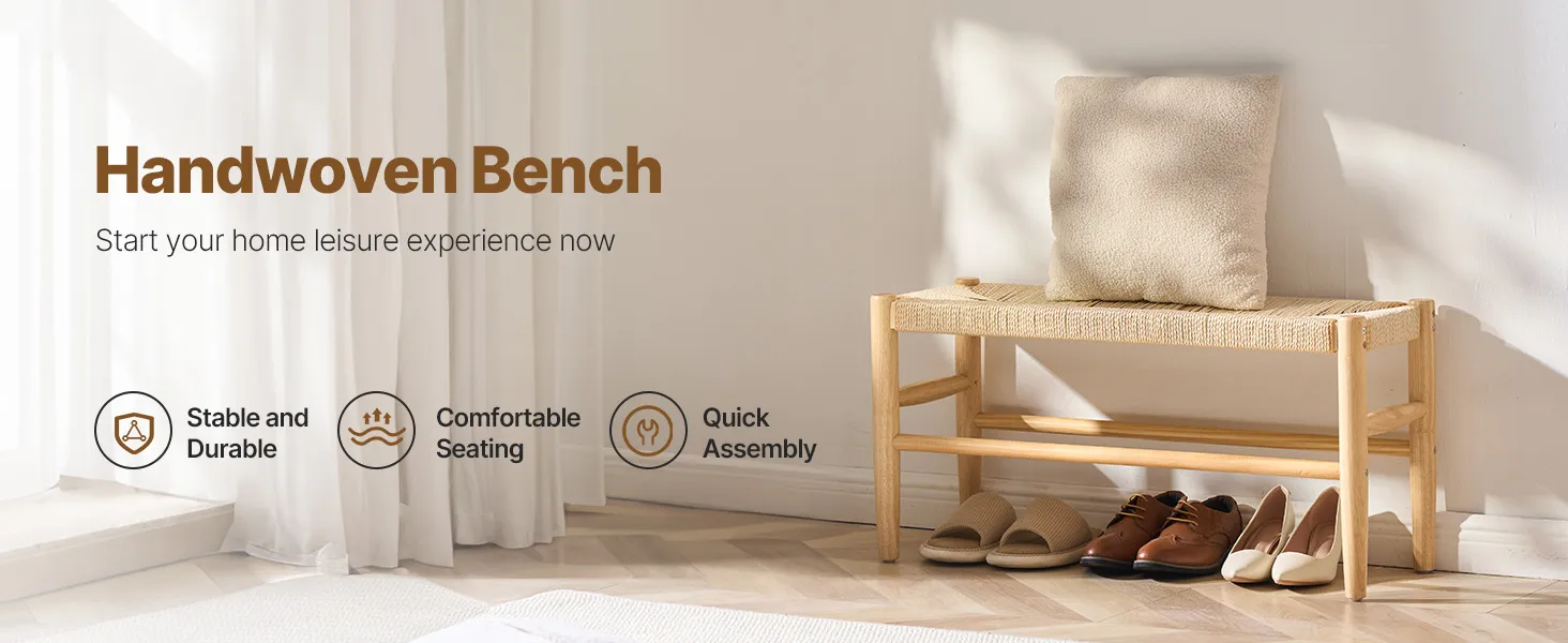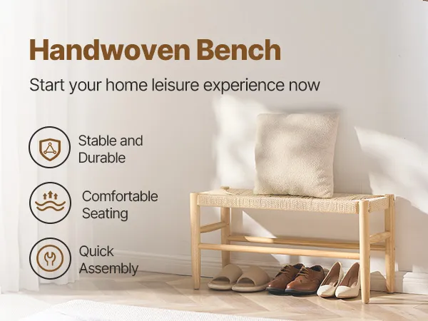 Handwoven Style: This rattan bench combines solid wood and handwoven rope, creating a stylish piece that enhances any entryway. With its natural look and artisanal touch, this bench is a ideal addition to your home, bringing warmth and comfort to your everyday life.