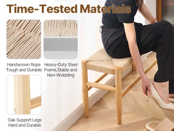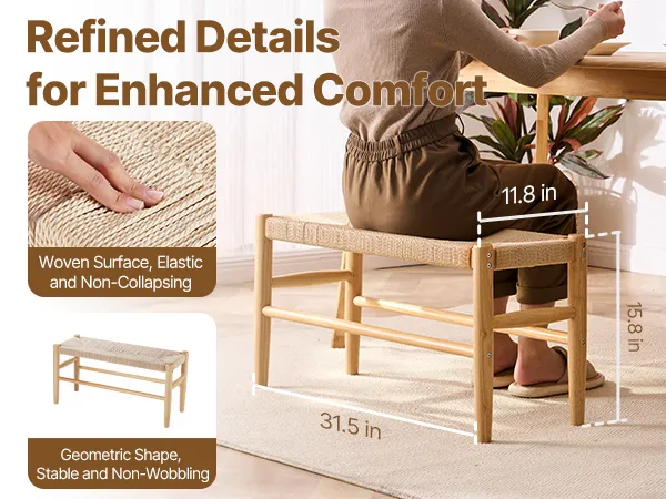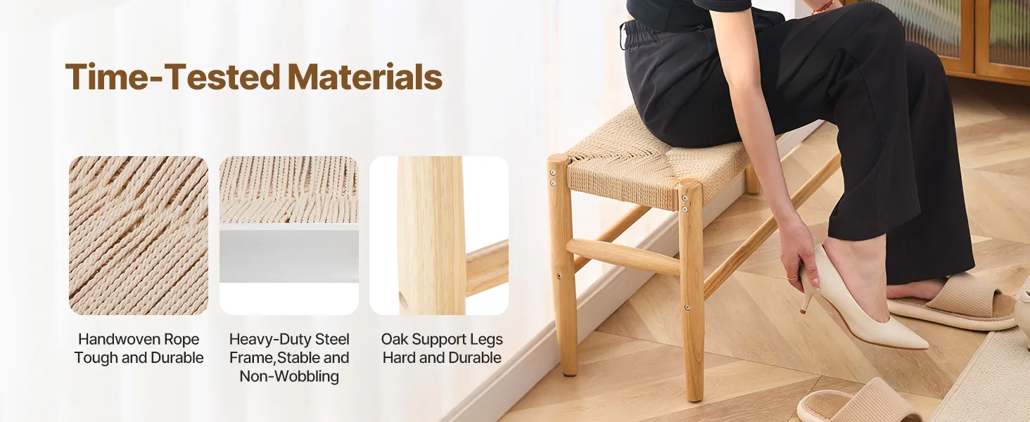 Quality and Stability: This entryway rattan bench offers quality and stability with its handwoven rope surface that avoids sagging, ensuring you can sit comfortably for hours. It stays cool in winter and breezy in summer! The heavy-duty steel frame and polished natural oak legs mean this bench is not just beautiful but also built to last.