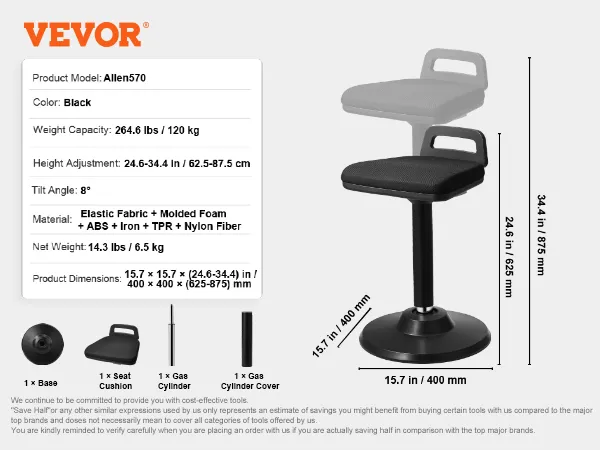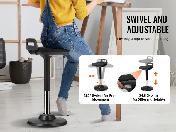 VEVOR Active Chair with Handle, Height-Adjustable (24.6-34.4") Wobble Chair Made of Elastic Fabric & 45 mm Foam, Ideal for Schools, Office and Home, 8° Tilt Angle, Age 12-18, Black