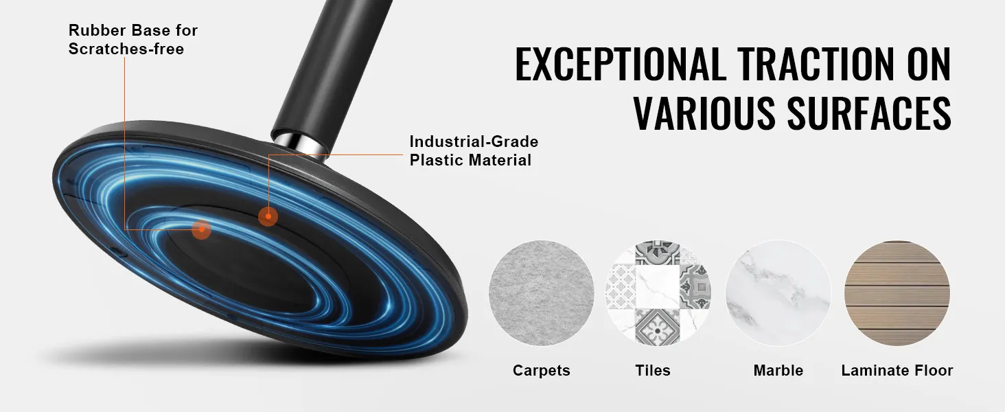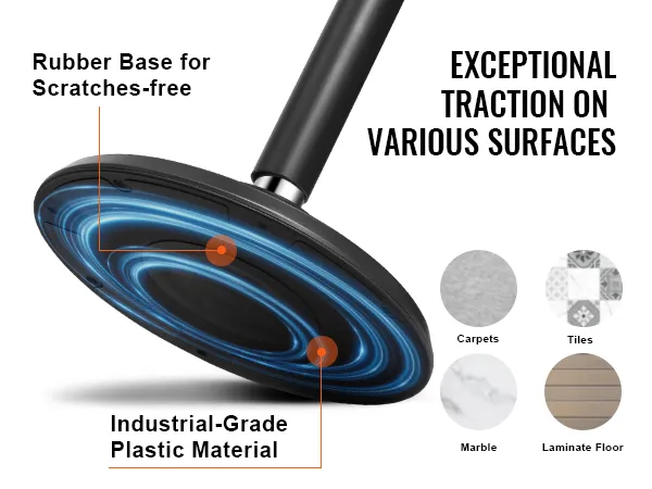 The large, sturdy base features a non-slip texture to prevent slipping, while a rubber coating protects floors from scratches.