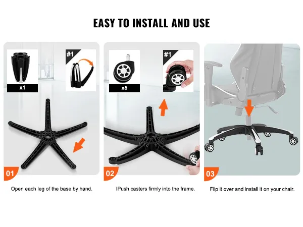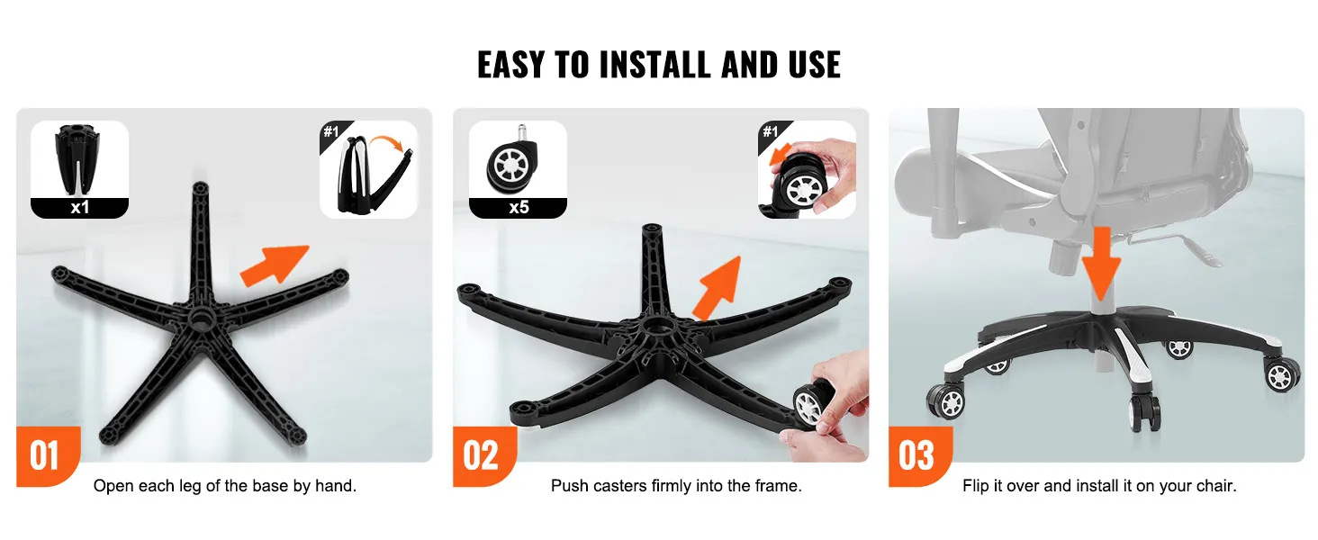 Simple Installation: No installation headaches here! Our heavy duty office chair base is easy to fit and works with most common chair types. With precise connections and a straightforward setup, you'll have it installed in no time—no special skills needed!