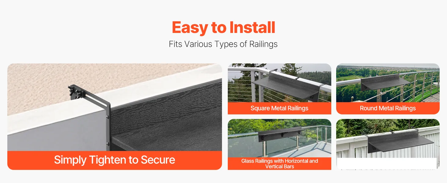 The adjustable bracket design allows for a quick and easy setup. No need for measurements – simply tighten the brackets to securely attach the table to any type of railing. You can install it without any prior DIY experience.