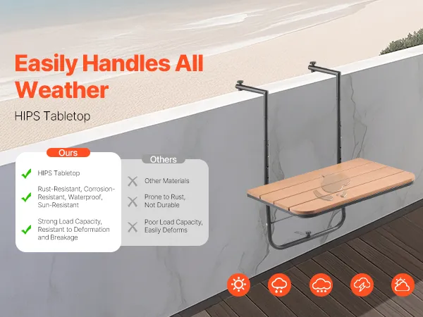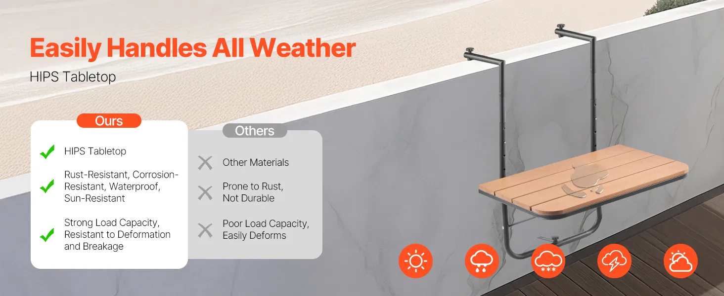 Durable & Rust-Resistant: Crafted with a high-quality HIPS tabletop, premium paint coating, and stainless steel brackets, this balcony railing table is designed to resist rust and corrosion. Built to withstand various weather conditions, it ensures reliable, long-lasting performance for outdoor use.