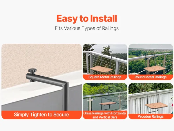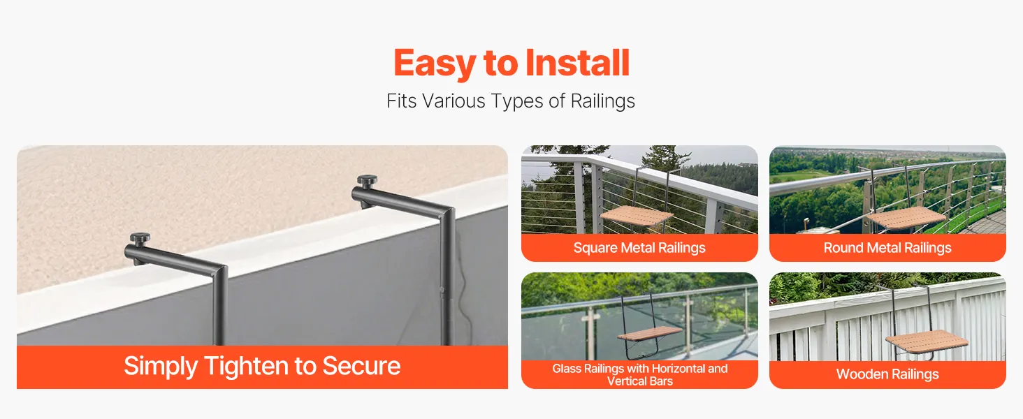 Highly Versatile and Easy to Install: With an adjustable bracket width ranging from 1 to 5.5 inches, this table fits various types of railings, including square, round, tile, and wood. No measuring or professional installation is needed – you can easily set it up yourself, even without prior experience.