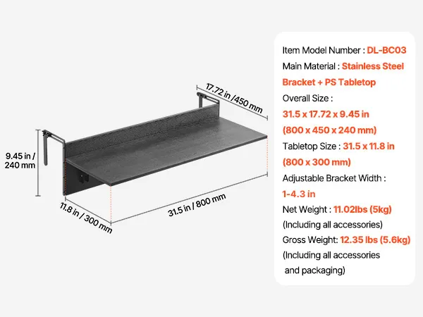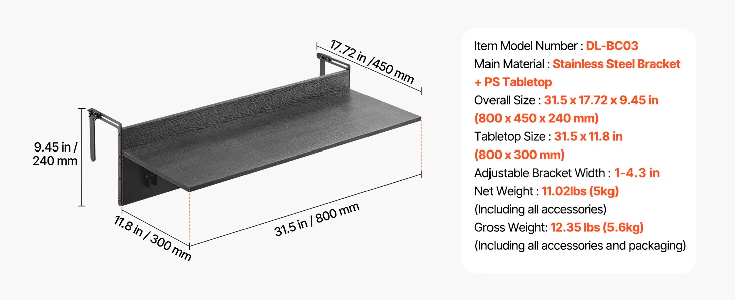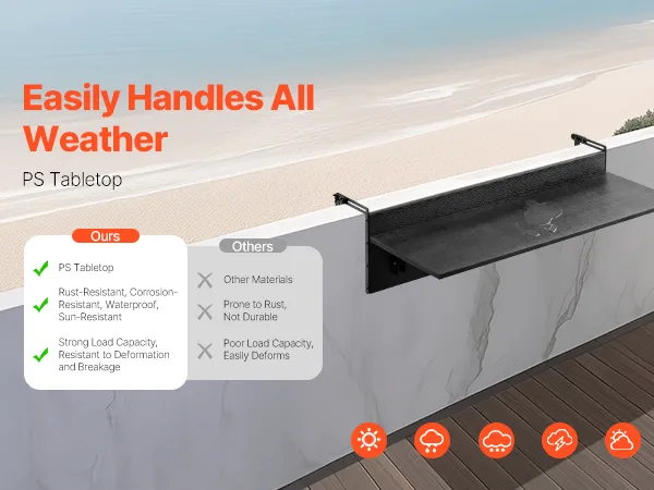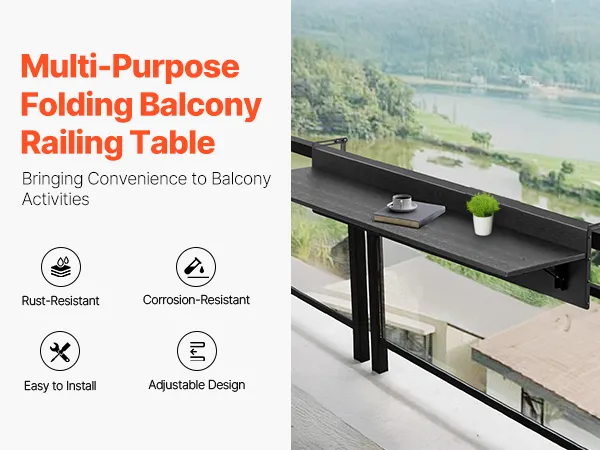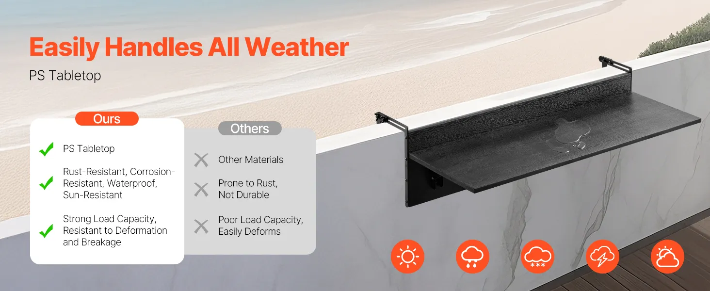 Durable & Rust-Resistant: Crafted with a PS tabletop, premium paint coating, and stainless steel brackets, this balcony railing table is built to resist rust and corrosion. It’s designed to withstand various weather conditions, ensuring reliable performance for long-term outdoor use.