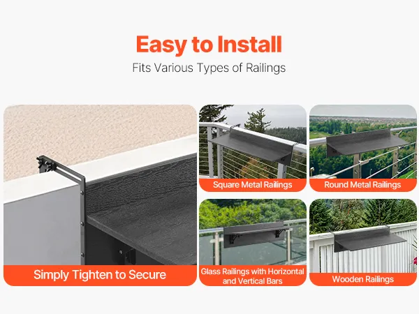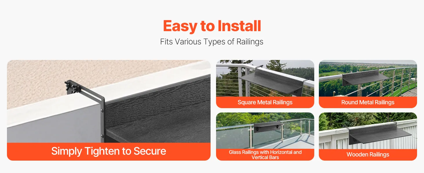 The adjustable bracket design allows for a quick and easy setup. No need for measurements – simply tighten the brackets to securely attach the table to any type of railing. You can install it without any prior DIY experience.