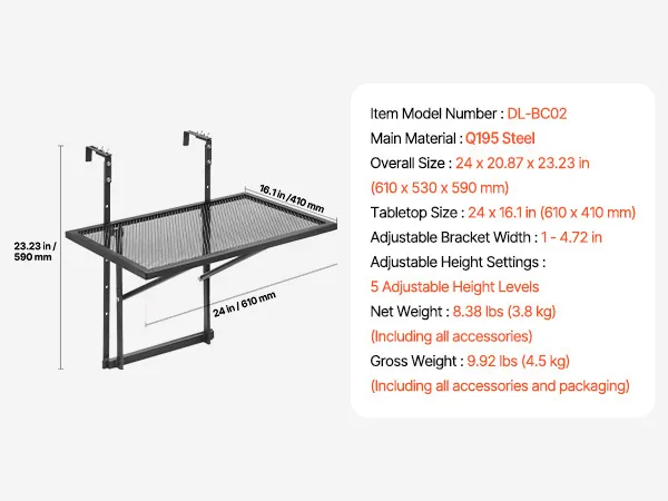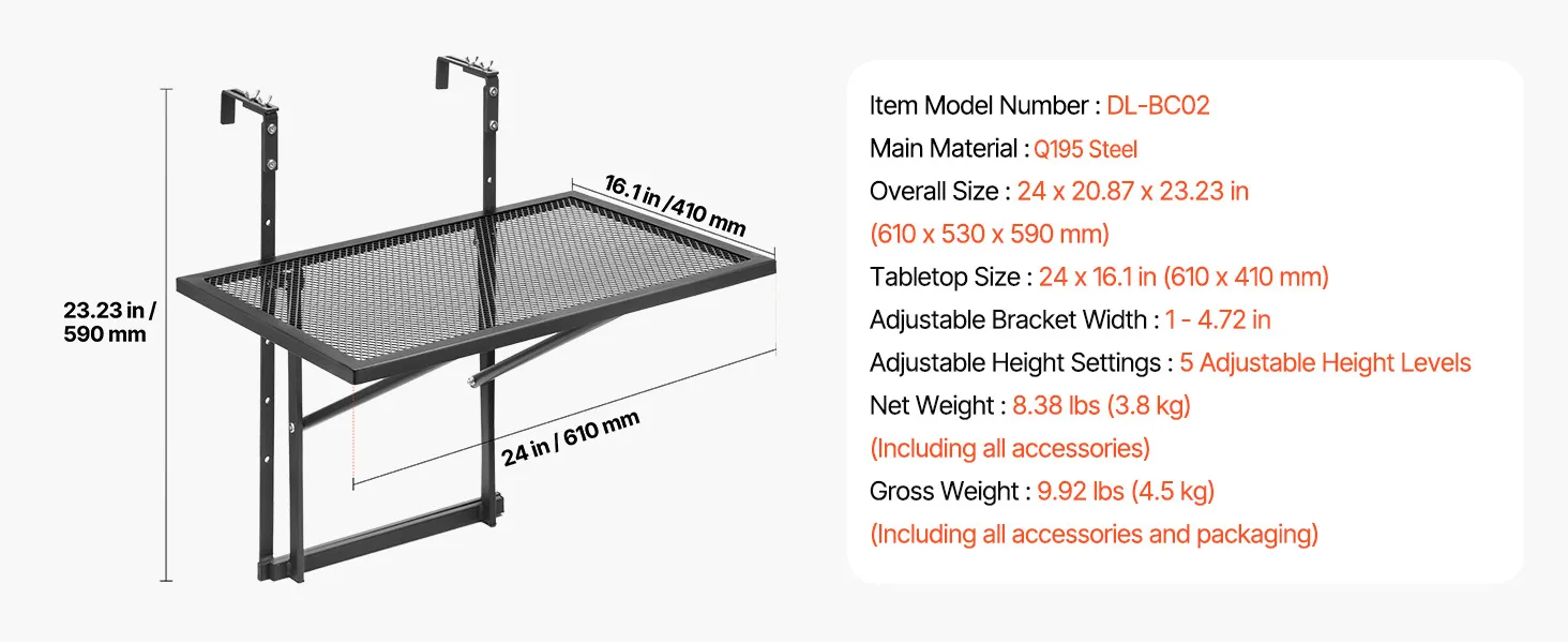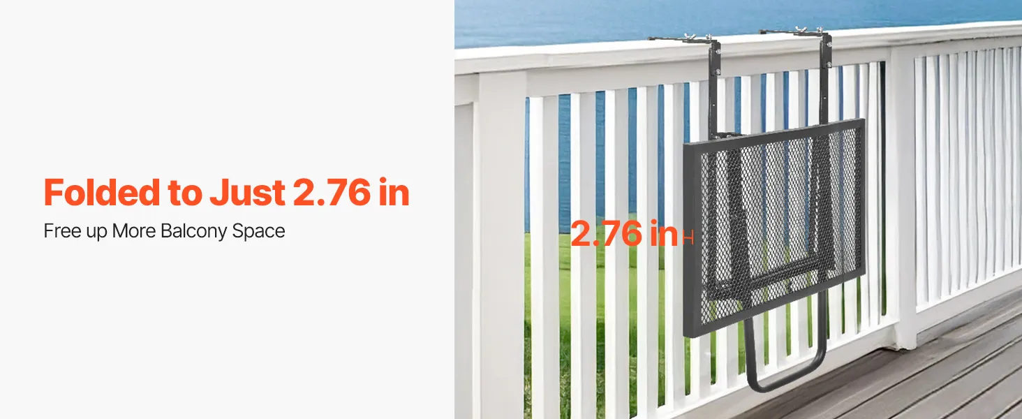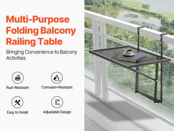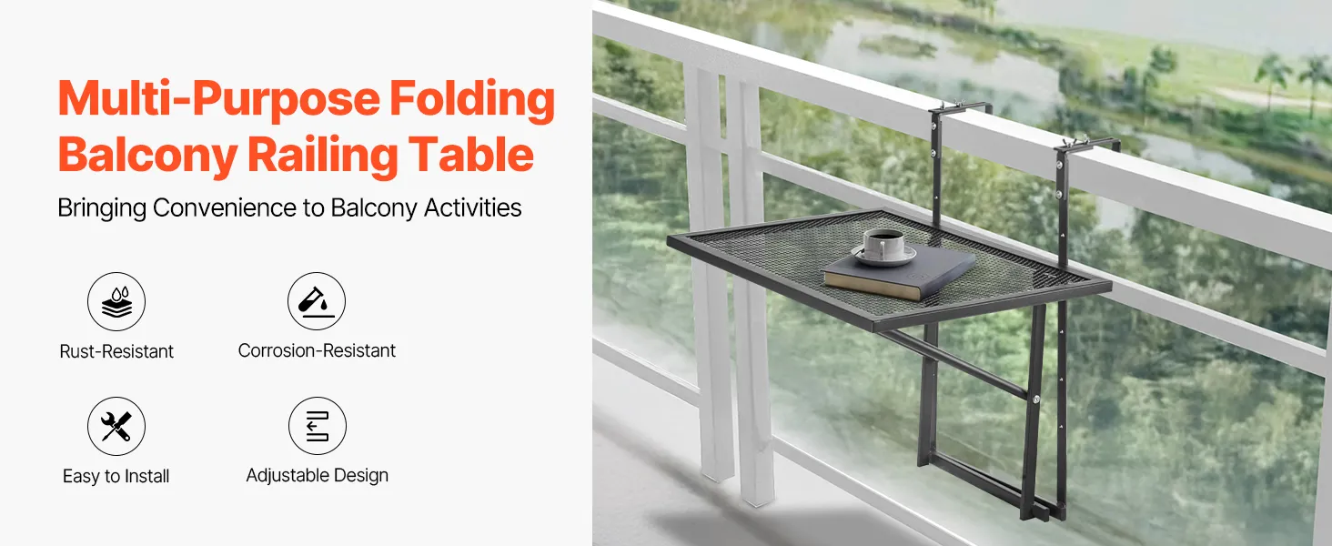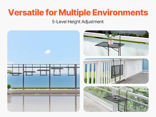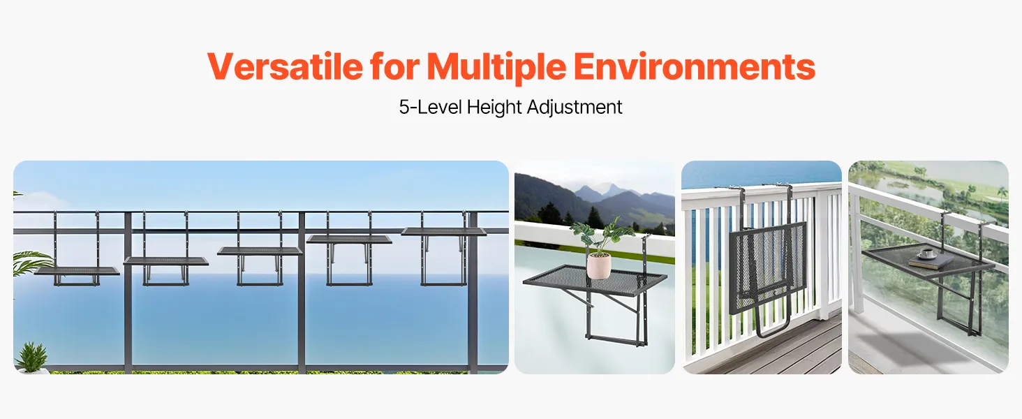 Multi-functional: This balcony hanging table offers 5 adjustable height settings, giving you the flexibility to use it for a range of activities. Whether you’re working, dining, enjoying a cup of coffee, or displaying plants, this table enhances your balcony experience.