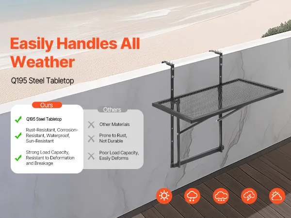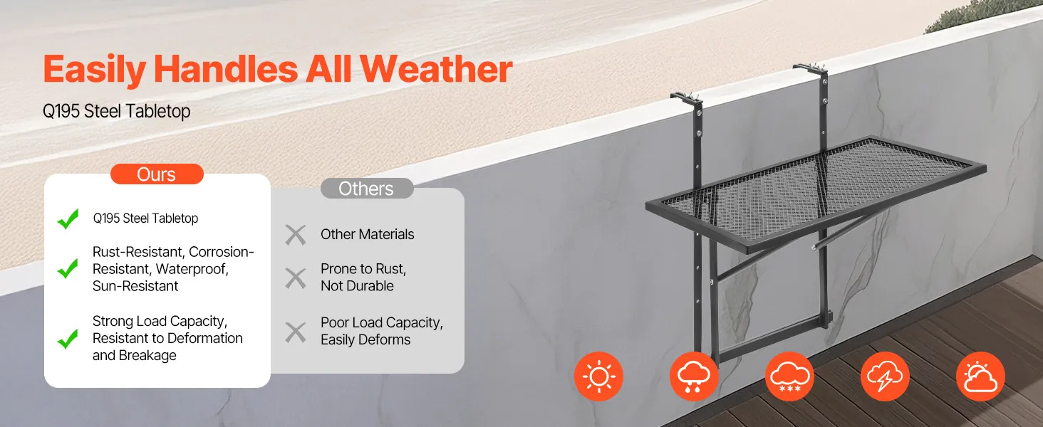 Durable and Weather-Resistant: Made from premium Q195 steel and coated with high-quality paint, this balcony railing table is highly resistant to rust and corrosion. Designed to withstand the elements, it’s perfect for long-term outdoor use in any weather condition.