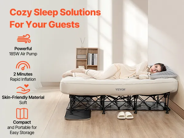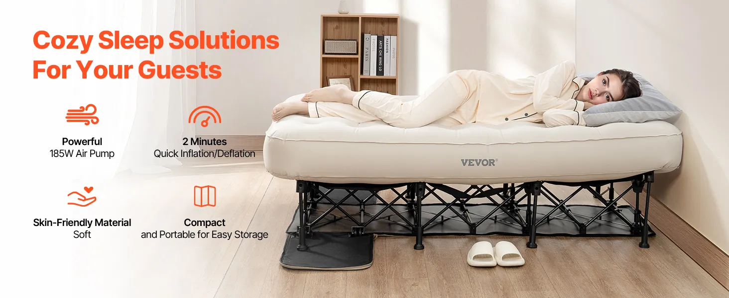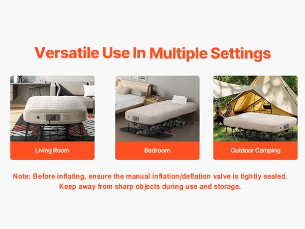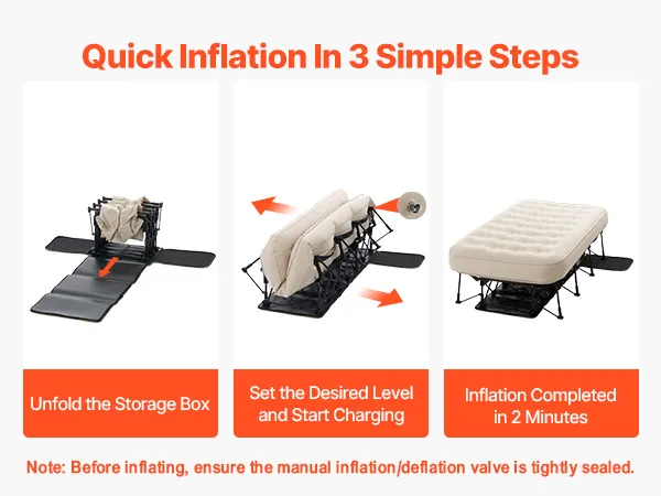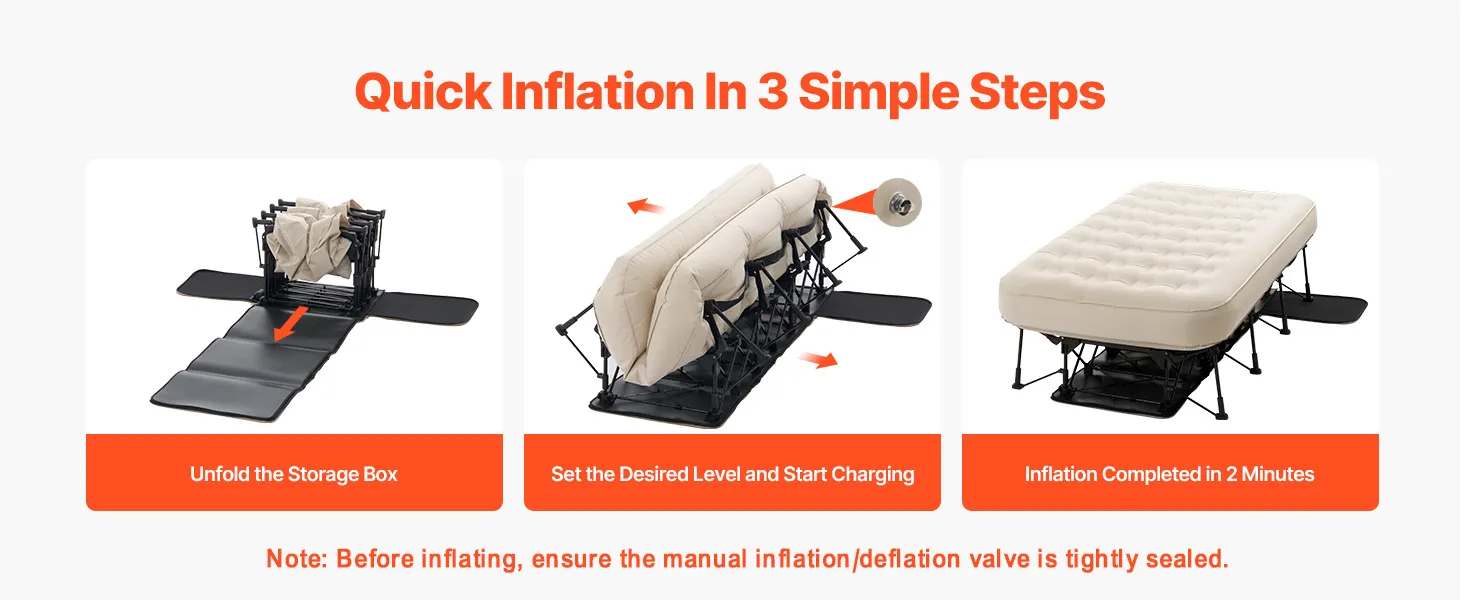 Easy Inflation: Simply open the casing, plug in the power, adjust the settings, and walk away. The air mattress with frame will fully inflate in just 2 minutes, making setup quick and effortless.