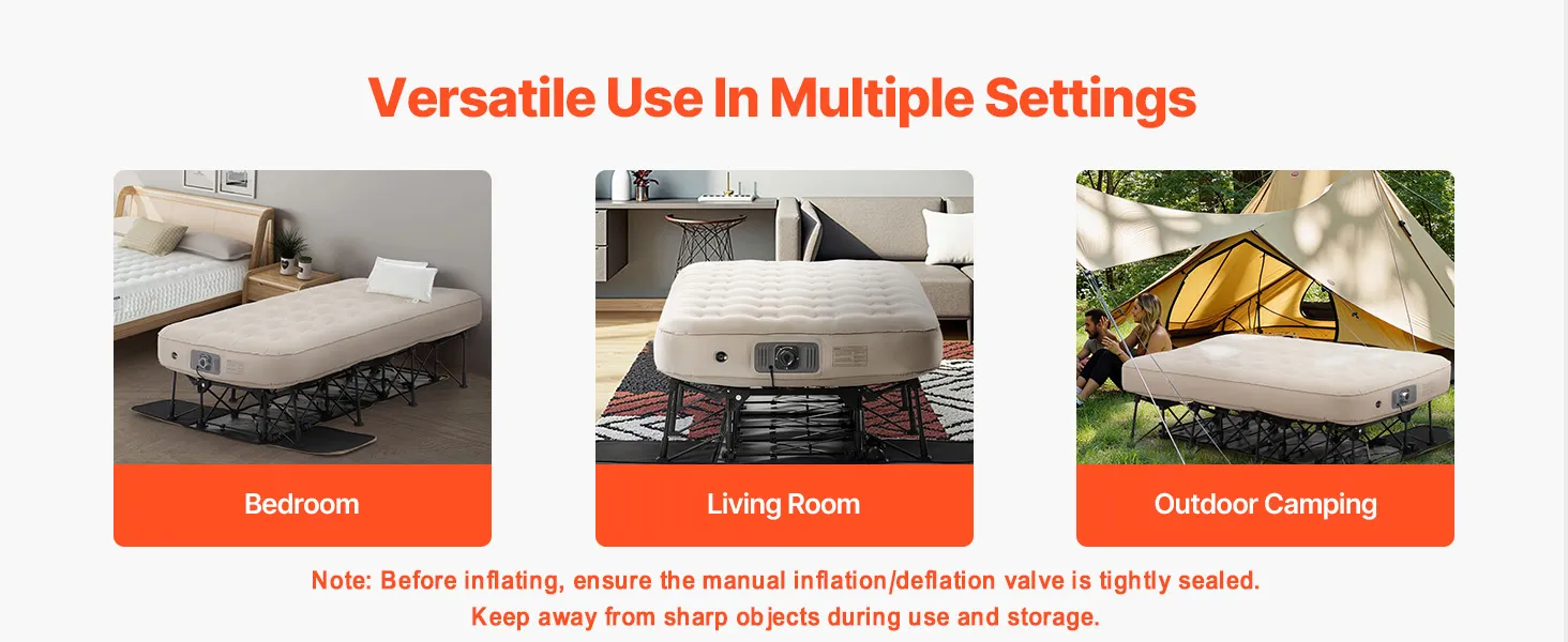 Versatile Use: This air mattress with frame is ideal for both indoor use (bedrooms, living rooms) for hosting guests, and outdoor camping (It requires power station for outdoor use).