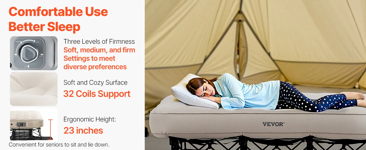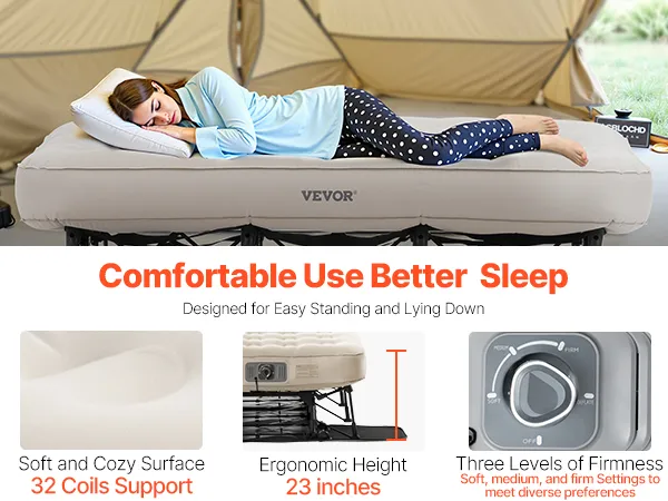 Comfortable Use: The air pump has 3 adjustable pressure settings (soft, medium, firm), allowing you to achieve your desired comfort level. Featuring 32 circular coils, the inflatable mattress with legs provides soft, ergonomic support, making it easy for seniors to get in and out.