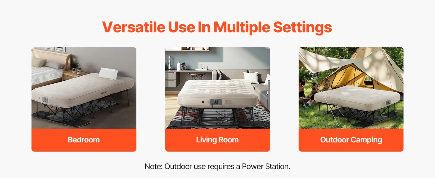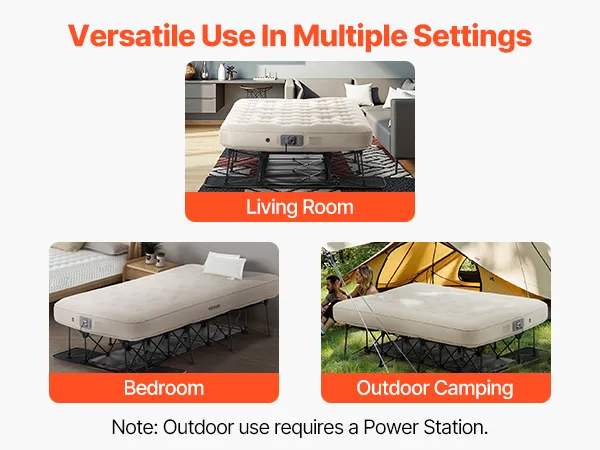 Versatile Use: This air mattress with frame is ideal for both indoor use (bedrooms, living rooms) for hosting guests, and outdoor camping (It requires power station for outdoor use).