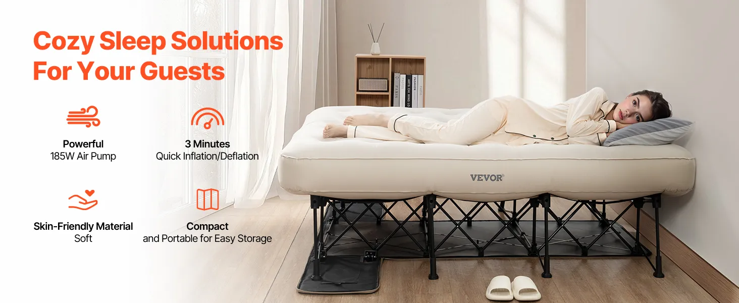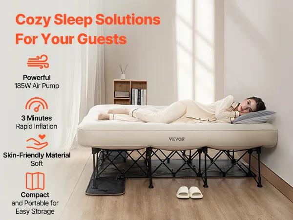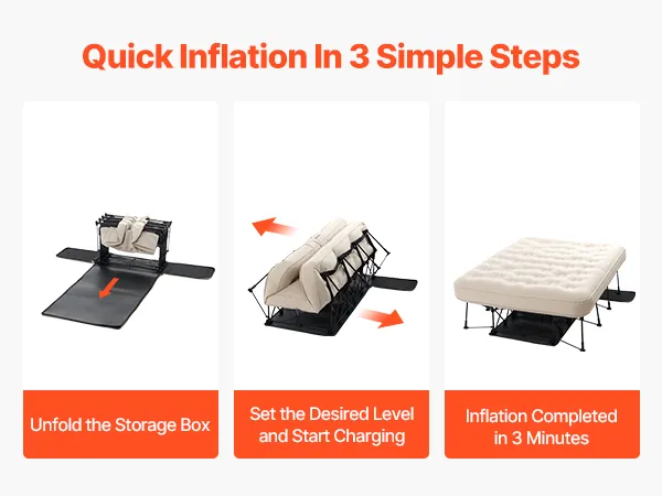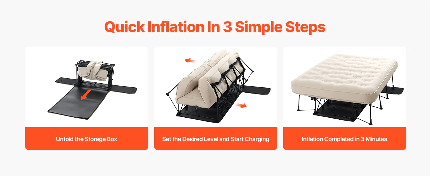 Easy Inflation: Simply open the casing, plug in the power, adjust the settings, and walk away. The air mattress with frame will fully inflate in just 3 minutes, making setup quick and effortless.