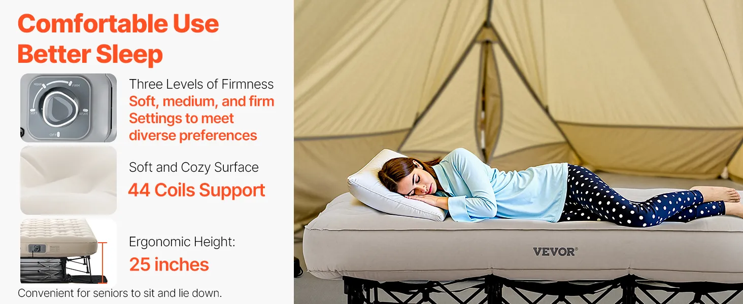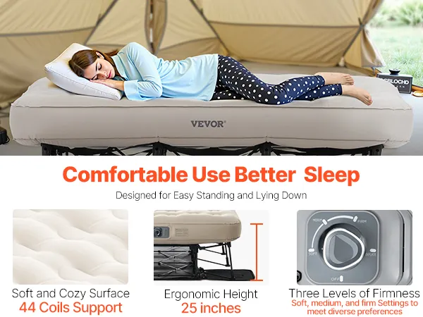 Comfortable Use: The air pump has 3 adjustable pressure settings (soft, medium, firm), allowing you to achieve your desired comfort level. Featuring 44 circular coils, the inflatable mattress with legs provides soft, ergonomic support, making it easy for seniors to get in and out.