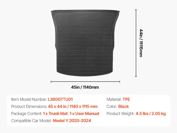 Our custom-fit cargo mat is compatible with 2020-2024 Tesla Model Y. Featuring precise 3D laser scanning molding, all-weather TPE material, anti-slip texture, and easy installation, it ensures a perfect fit and keeps your car's interior clean and pristine.