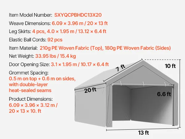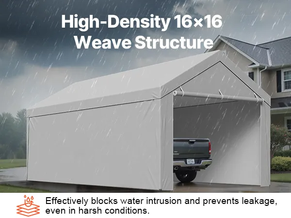 Robuuste constructie: het draagbare garagezeil is gemaakt van 210g PE-stof (180g PE-zijwanden) en heeft een 16x16 weving. Het is robuuster dan conventionele zeilen. Dubbel gesealde naden en ogen zorgen voor een strakke, veilige pasvorm en voorkomen het risico op scheuren en lekken.