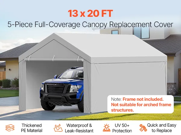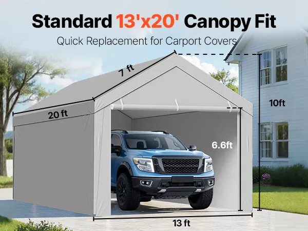 De standaard carportvervangingsoverkapping, met een afmeting van 6,09 x 3,96 m, is geschikt voor de meeste carportframes. Voor een eenvoudige vervanging is geen zaagwerk of aanpassing nodig. Ideaal voor een snelle doe-het-zelf installatie.