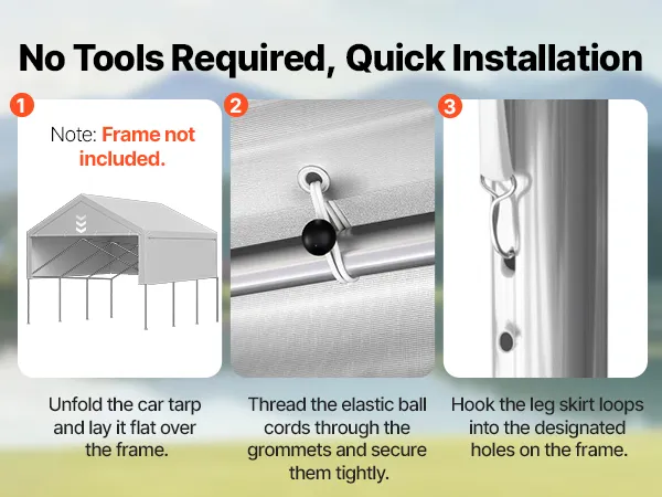 Snelle en eenvoudige installatie: ons autotentdak wordt geleverd met 96 spanbanden, 4-poots rokken en zijpanelen voor een veilige en probleemloze installatie. Geen gereedschap nodig. Eén persoon kan de oude hoes binnen enkele minuten vervangen, wat tijd en moeite bespaart.
