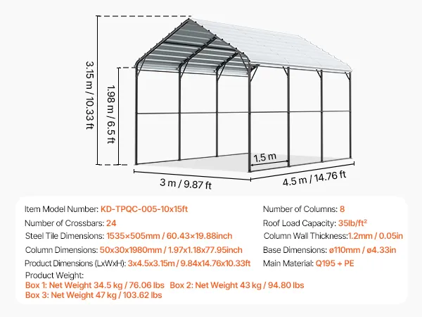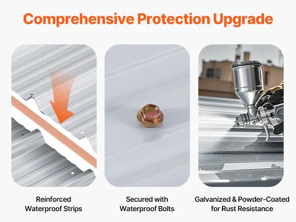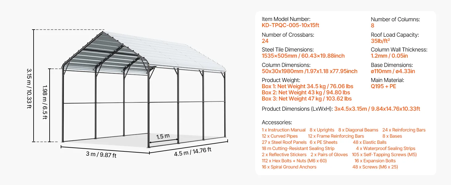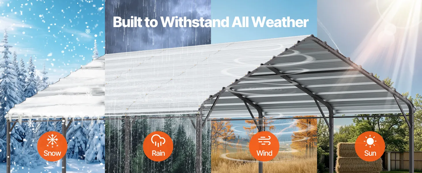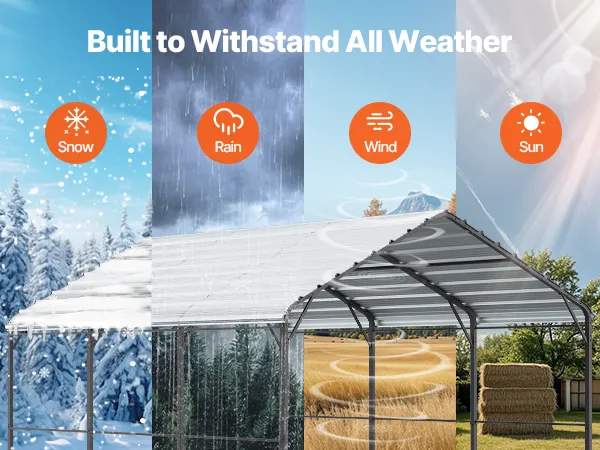 Stabiel dak: Het dak is gemaakt van gegalvaniseerd staal en biedt langdurige bescherming. Het is uitgerust met een afdichtingstape met hoge dichtheid die regenlekken voorkomt, waardoor het uitstekend geschikt is voor barre weersomstandigheden. Met een dakcapaciteit van 35 lb/ft² is deze carport met stalen dak ideaal om uw voertuigen en uitrusting tegen de elementen te beschermen.