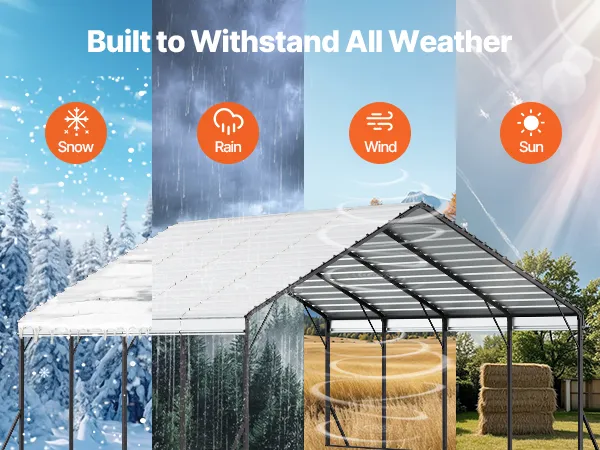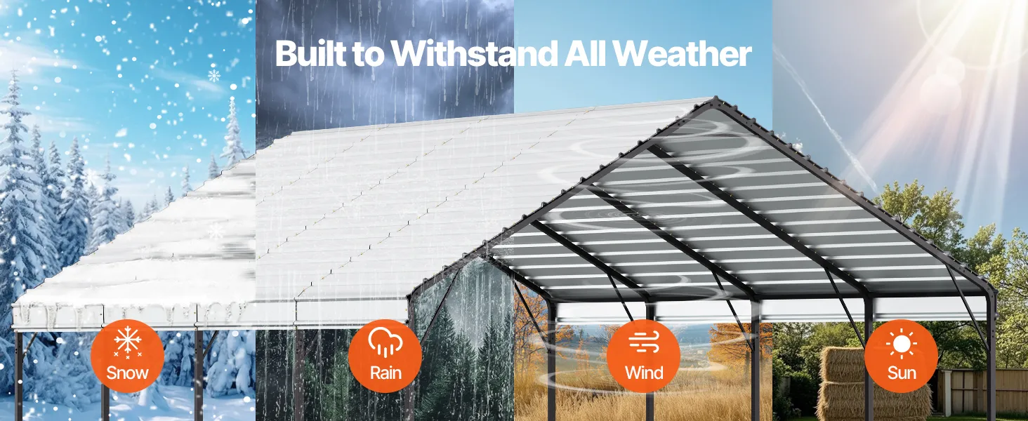 Durable Roof: The roof is made of galvanized steel, offering long-lasting protection. It comes equipped with upgraded high-density seal tape to prevent leaks from rain on the roof panels, providing exceptional weather protection. The car garage supports up to 35 lbs/ft², guarding your vehicles and equipment from harsh weather.