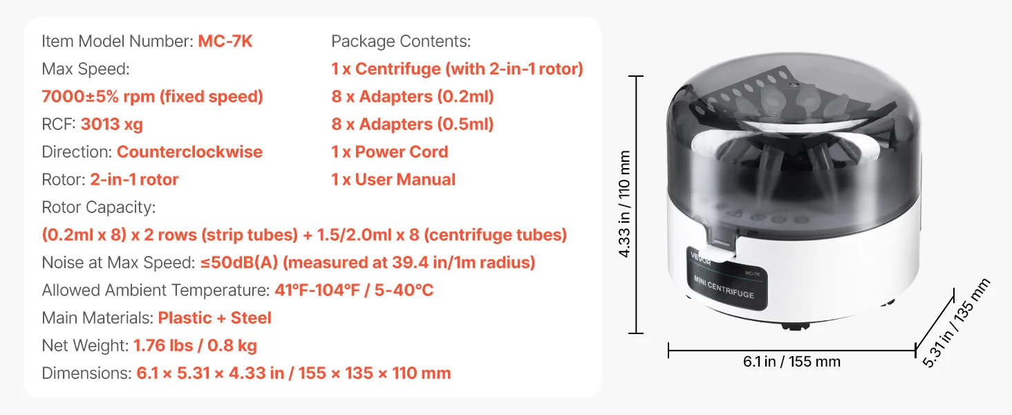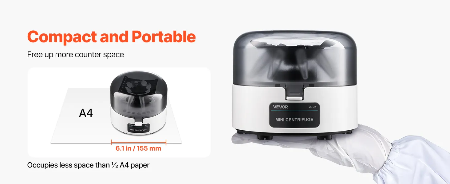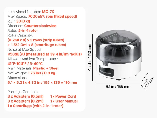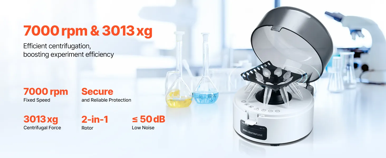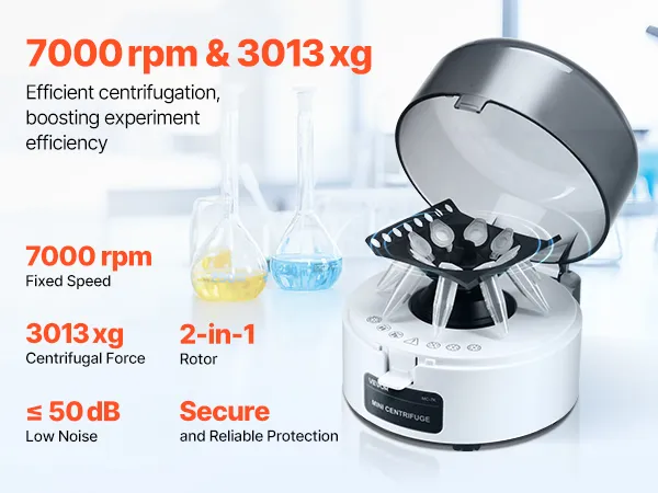 Hoge snelheid en centrifugale kracht: Deze centrifuge werkt met 7000 ±5% tpm en genereert tot 3013 xg. Dit garandeert snelle, betrouwbare en herhaalbare monsterscheiding voor uw experimenten.