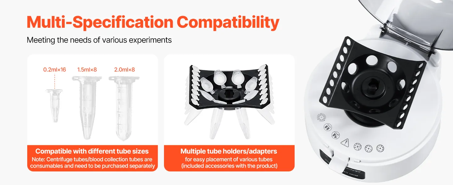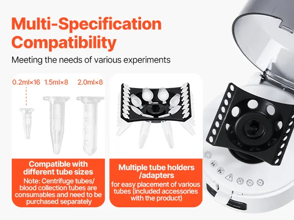 2-in-1-rotor: deze centrifuge heeft ruimte voor (0,2 ml x 8) x 2 rijen (stripbuizen) en 8 x 1,5/2,0 ml centrifugebuizen, waardoor gelijktijdige verwerking van verschillende monstergroottes mogelijk is voor verbeterde efficiëntie en veelzijdigheid