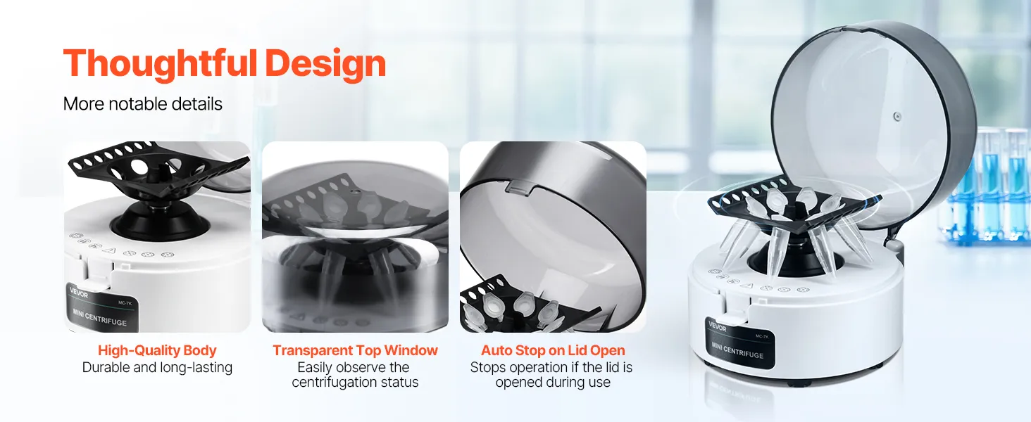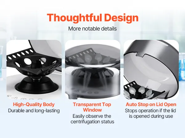Veilige werking: Om veiligheidsredenen stopt de laboratoriumtafelcentrifuge bij het openen van het deksel en start bij het sluiten. De symmetrische opstelling van de buizen zorgt voor een soepele werking en voorkomt trillingen en schade.
