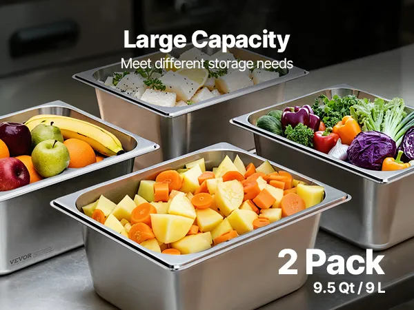 Genoeg ruimte voor eten: deze hotelpannenset (148 mm diep, 2-pack met deksel) heeft een inhoud van 9,5 liter (9 liter) en voldoet daarmee aan al je dagelijkse kookbehoeften. Ideaal voor het koken, bewaren en serveren van eten, perfect voor vlees, groenten, fruit, ijs en meer.
