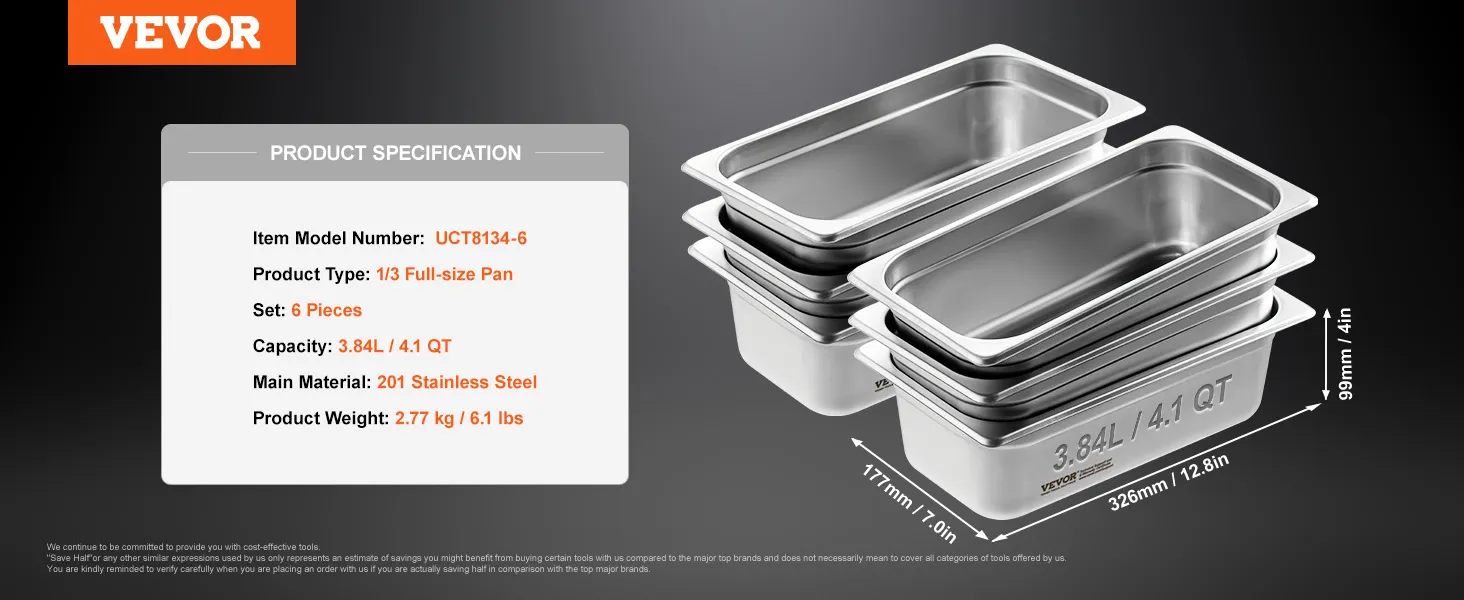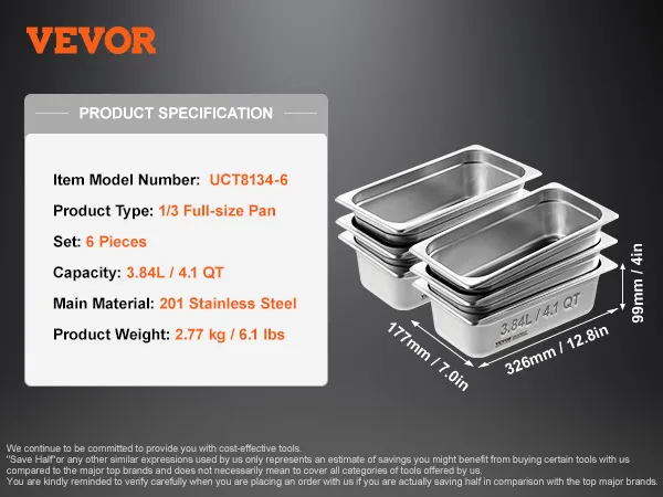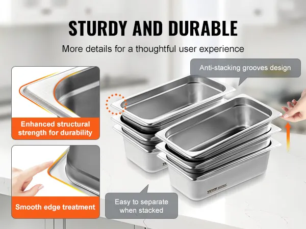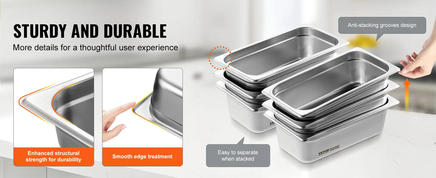De hotelpannen van VEVOR zijn gemaakt van roestvrij staal SUS201. Dit zorgt ervoor dat ze sterk en duurzaam zijn. Ze kunnen intensief gebruik in de loop van de tijd aan. Het 0,8 mm dikke staal voegt sterkte toe. Deze pannen zijn bestand tegen roest en corrosie. Het maakt ze ideaal voor commercieel gebruik. Het anti-stapelgroefontwerp maakt ze steviger. Geen lassen of gaten in het gladde oppervlak beschermen uw handen. We maken onze hotelpannen met duurzaamheid en betrouwbaarheid in gedachten. Deze pannen zijn ideaal voor elke cateringzaak of restaurant.