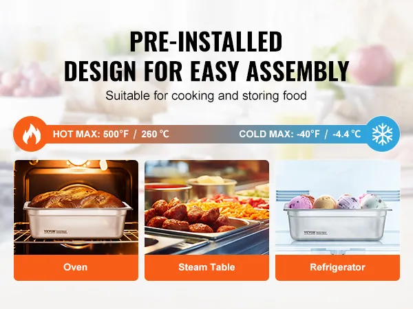 Hitte- en koudebestendig: de roestvrijstalen hotelpan is bestand tegen temperaturen tot 260 °C (500 °F) en tot -40 °C (-40 °F). Het is geschikt voor gebruik in koelkasten en vriezers, ovens en steamers.