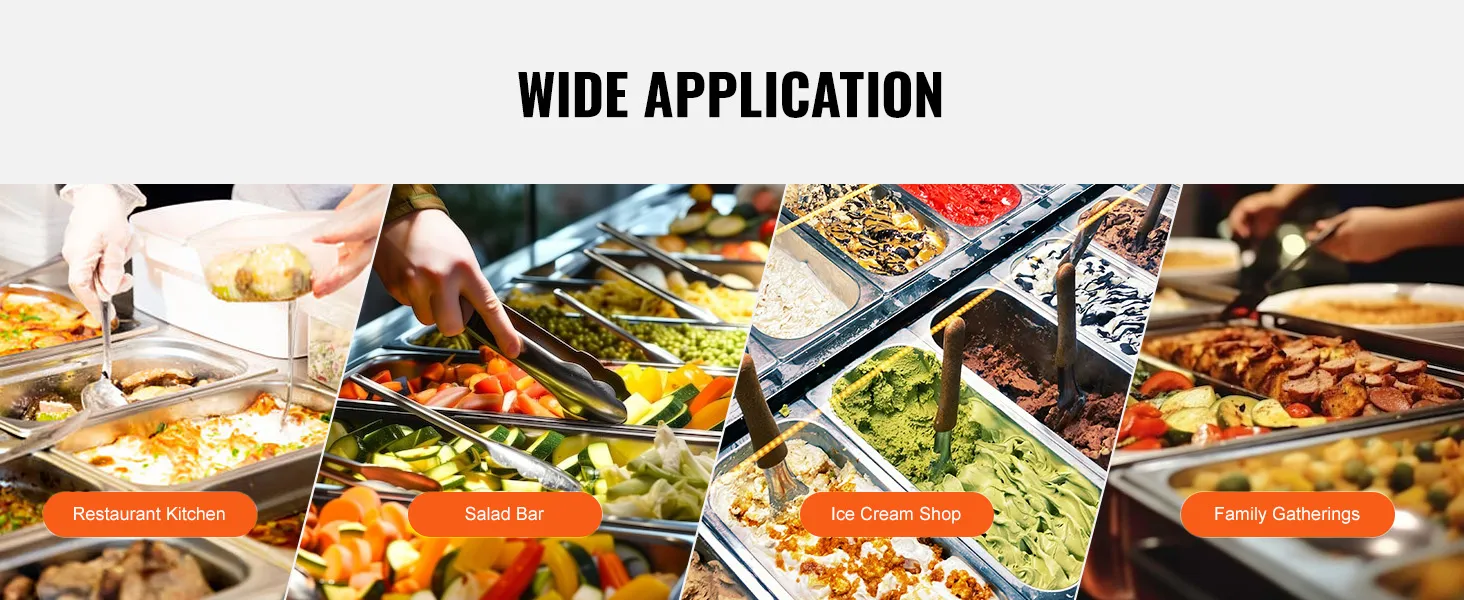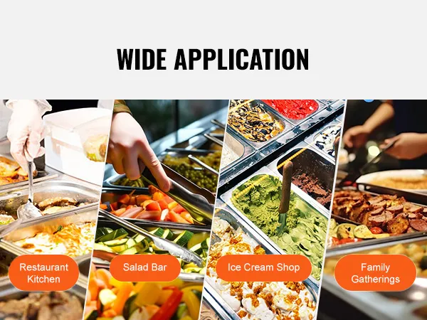 De industriële en wetenschappelijke roestvrijstalen tafelpannen zijn geschikt voor diverse voedingsmiddelen zoals vlees, groenten, fruit en ijs. Ze zijn ideaal voor restaurants, saladebars, ijssalons en familiefeesten.