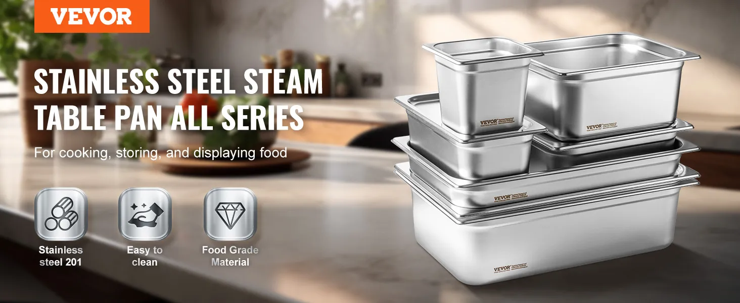 1/3 Size Steam Table Pan with Lids: 8 pack of 1/3-size steam table pans, made from food-grade SUS201 stainless steel. These pans are perfect for holding various foods such as meats, vegetables, fruits, ice cream, and more.