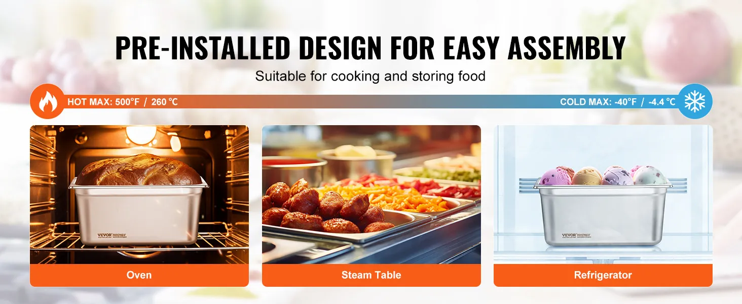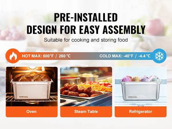 Heat and Cold Resistant: The stainless steel hotel pan can withstand temperatures up to 500℉ / 260℃ and as low as -40℉ / -40℃. It is suitable for use in refrigerators, freezers, ovens, and steam tables.